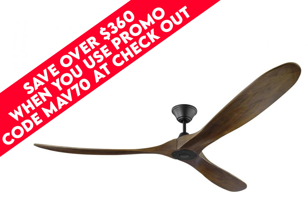 The Maverick 70 in Matte Black w Dark Walnut Blades features an 85.0 X 28.0 6-speed motor with a Thirteen-degree blade pitch. With a sleek modern silhouette, a DC motor, and super energy efficiency, the 70" Maverick Max ceiling fan features softly rounded blades and elegantly simple housing. Maverick Max features a 3-blade design that delivers a distinct profile and incredible airflow for living rooms, great rooms, or outdoor covered areas. It includes a hand-held remote with six speeds. It reverses and is available in six distinct finish options: Brushed Steel housing with Dark Walnut blades, Brushed Steel housing with Koa blades, Matte Black housing with Dark Walnut Blades, Aged Pewter housing with Light Grey Weathered Oak blades, Matte Black housing with Matte Black blades and Matte White housing with Matte White blades. All versions feature beautiful hand-carved balsa wood blades. ENERGY STAR qualified. Maverick fans are damp-rated and may be used indoors or in covered areas.