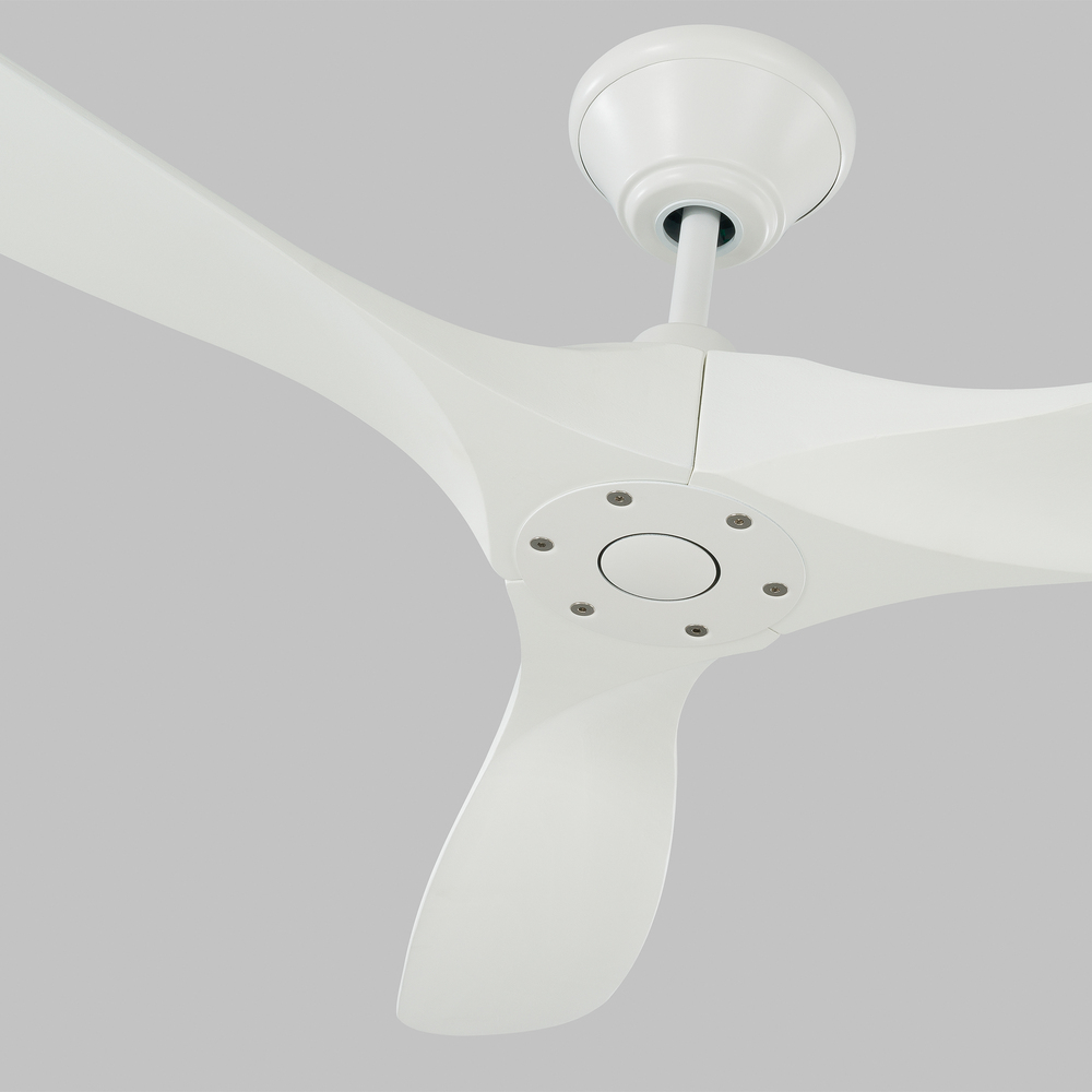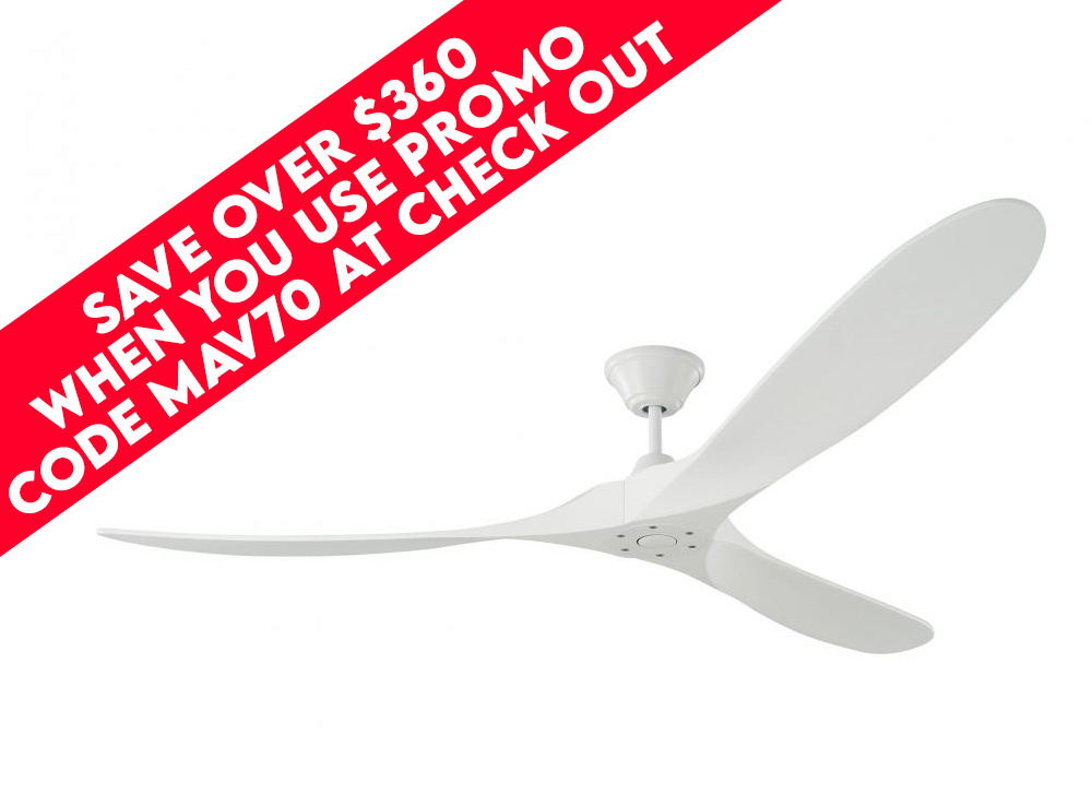 The Maverick 70 in Matte White features a 85.0 X 28.0 6 speed motor with a Thirteen degree blade pitch. With a sleek modern silhouette, a DC motor and super energy-efficiency, the 70" Maverick Max ceiling fan from features softly rounded blades and elegantly simple housing. Maverick Max features a 3-blade design that delivers a distinct profile and incredible airflow for living rooms, great rooms or outdoor covered areas. It includes a hand-held remote with six speeds and reverse, and is available in six distinct finish options: Brushed Steel housing with Dark Walnut blades, Brushed Steel housing with Koa blades, Matte Black housing with Dark Walnut Blades, Aged Pewter housing with Light Grey Weathered Oak blades, Matte Black housing with Matte Black blades and Matte White housing with Matte White blades. All versions feature beautiful hand-carved, balsa wood blades. ENERGY STAR qualified. Maverick fans are damp-rated, and may be used indoors or in covered areas.