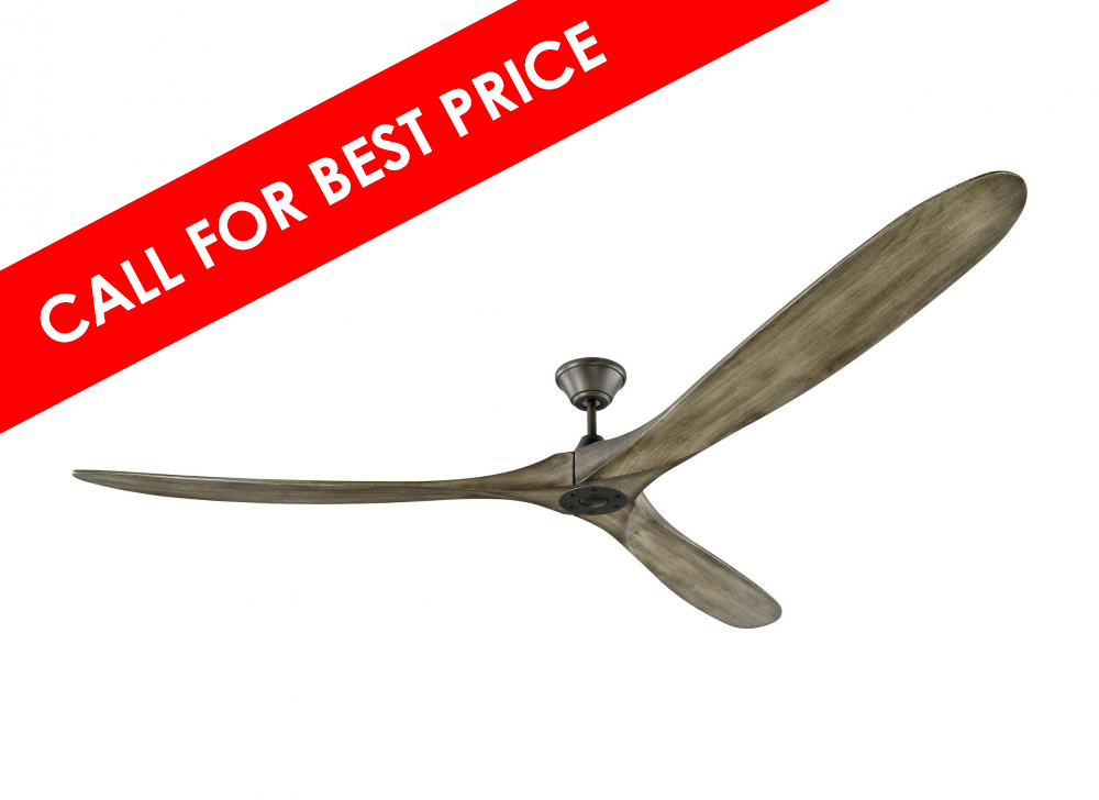 The Maverick 88 in Aged Pewter features a 120.0 X 25.0 6 speed motor with a Thirteen degree blade pitch. With a sleek modern silhouette, a DC motor and super energy-efficiency, the 88" Maverick Super Max ceiling fan from features softly rounded blades and elegantly simple housing. Maverick Super Max has an impressive 88-inch blade sweep and a 3-blade design that delivers a distinct profile and incredible airflow for extra-large living rooms, great rooms or outdoor covered areas. It includes a hand-held remote with six speeds and reverse, and is available in six distinct finish options: Brushed Steel housing with Dark Walnut blades, Brushed Steel housing with Koa blades, Matte Black housing with Dark Walnut Blades, Aged Pewter housing with Light Grey Weathered Oak blades, Matte Black housing with Matte Black blades and Matte White housing with Matte White blades. All versions feature beautiful hand-carved, balsa wood blades.