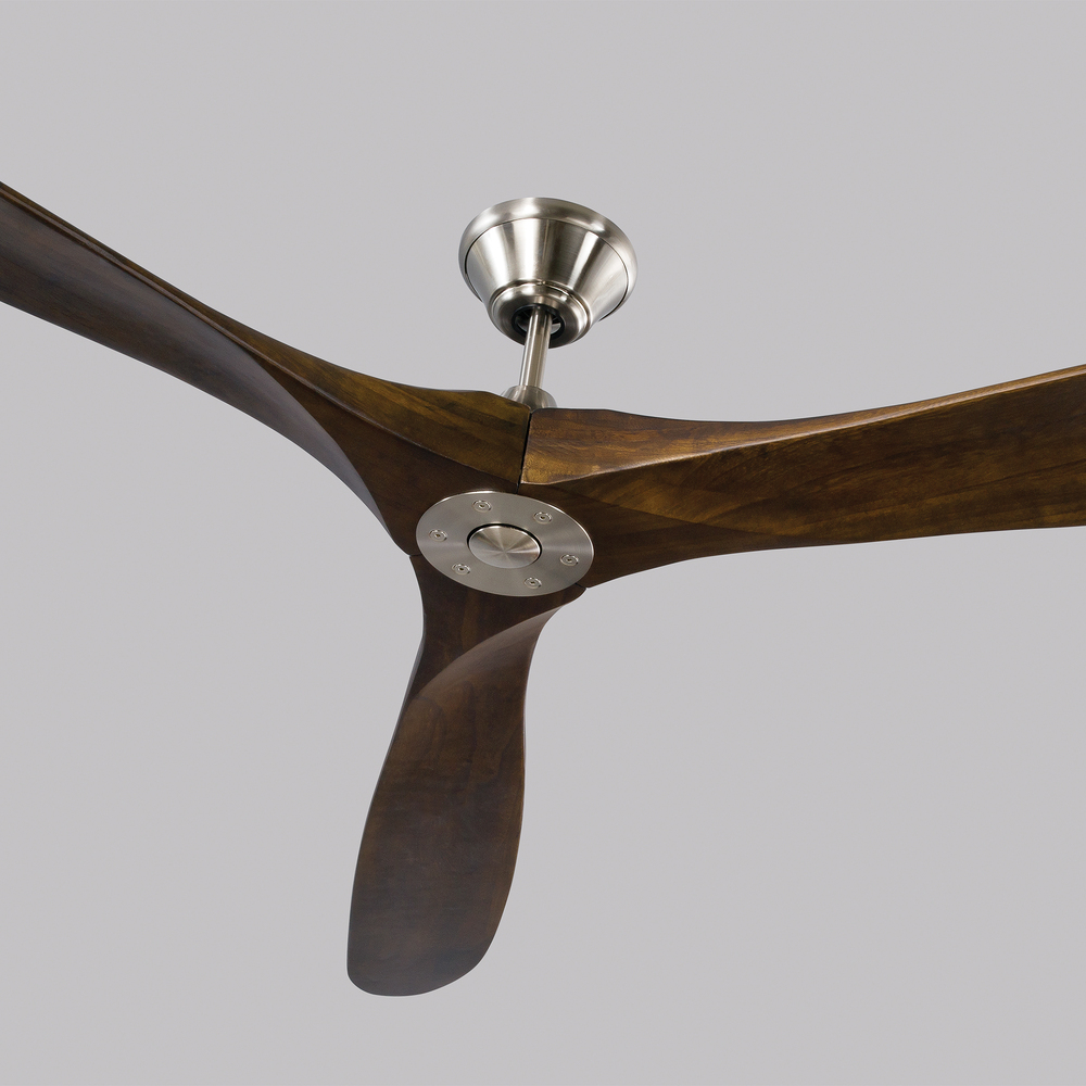The Maverick 88 in Brushed Steel w Dark Walnut Blades features a 120.0 X 25.0 6 speed motor with a Thirteen degree blade pitch. With a sleek modern silhouette, a DC motor and super energy-efficiency, the 88" Maverick Super Max ceiling fan from features softly rounded blades and elegantly simple housing. Maverick Super Max has an impressive 88-inch blade sweep and a 3-blade design that delivers a distinct profile and incredible airflow for extra-large living rooms, great rooms or outdoor covered areas. It includes a hand-held remote with six speeds and reverse, and is available in six distinct finish options: Brushed Steel housing with Dark Walnut blades, Brushed Steel housing with Koa blades, Matte Black housing with Dark Walnut Blades, Aged Pewter housing with Light Grey Weathered Oak blades, Matte Black housing with Matte Black blades and Matte White housing with Matte White blades. All versions feature beautiful hand-carved, balsa wood blades.