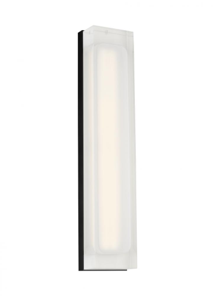 Delicately designed, the Milley wall sconce by Sean Lavin is constructed of sandblasted crystal and formed around an inner etched diffuser creating a beautiful glow. The integrated LED provides a visual elegance perfect for your bathroom, hallway, and bedroom. Offered in modern finishes and measures 20" tall 4" wide. Lamping options are compatible with most dimmers. Refer to Dimming Chart for more information