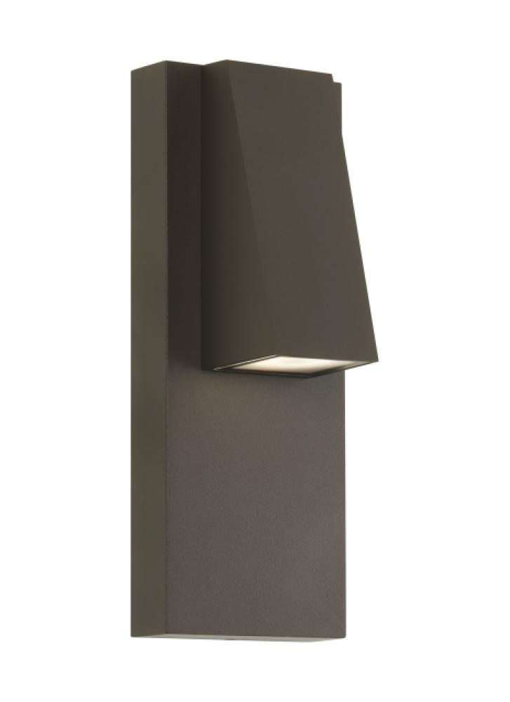With its highly pitched roofline, the modern lighting design of the Peak outdoor wall sconce light by Sean Lavin for Visual Comfort Modern is reminiscent of a clapboard shingle. The angular LED downlight gently grazes the surface of the extended back plate. Cleverly hidden hardware ensures a clean look. Perfect for front door outdoor lights or the back of a home as back porch lights, Peak is available in modern finishes.