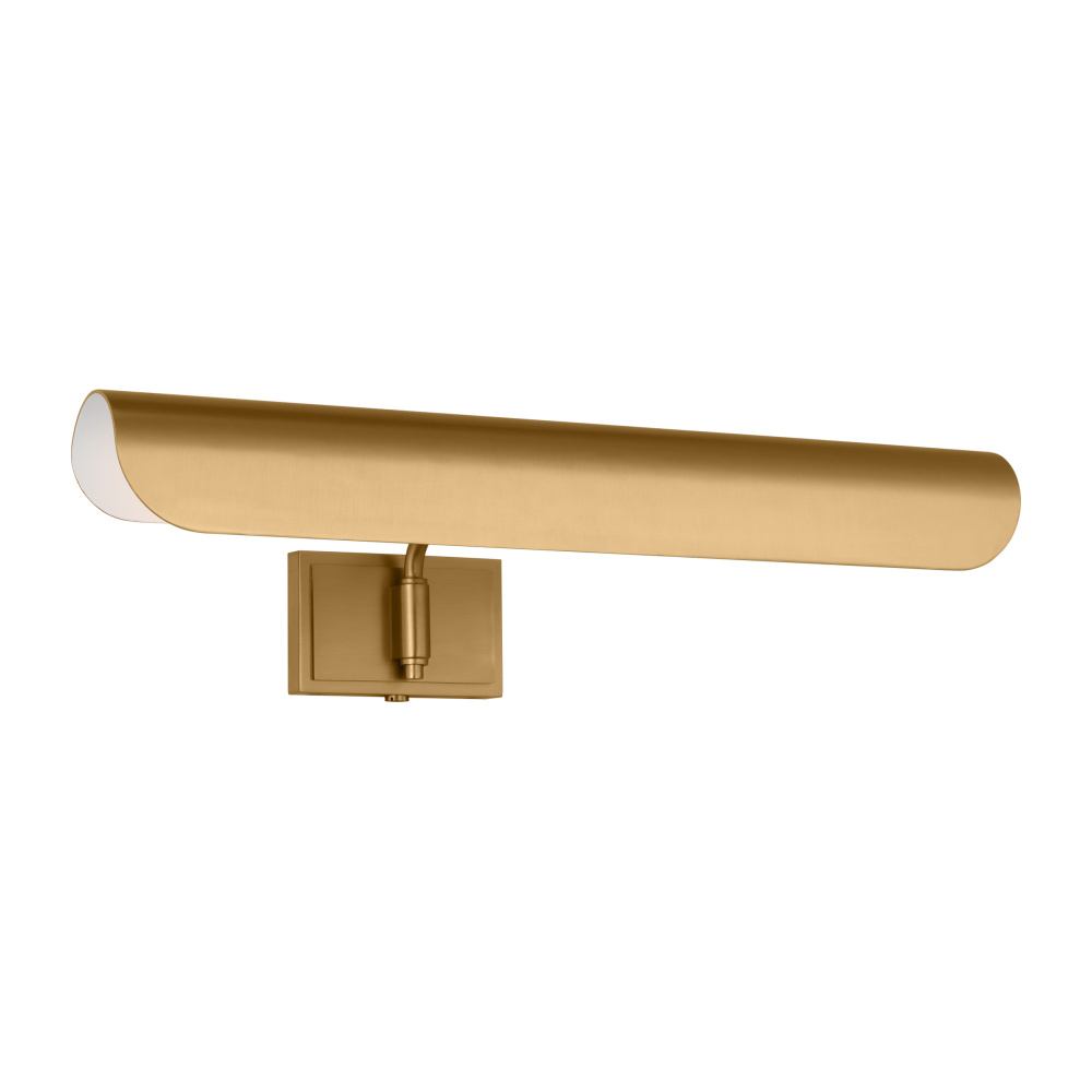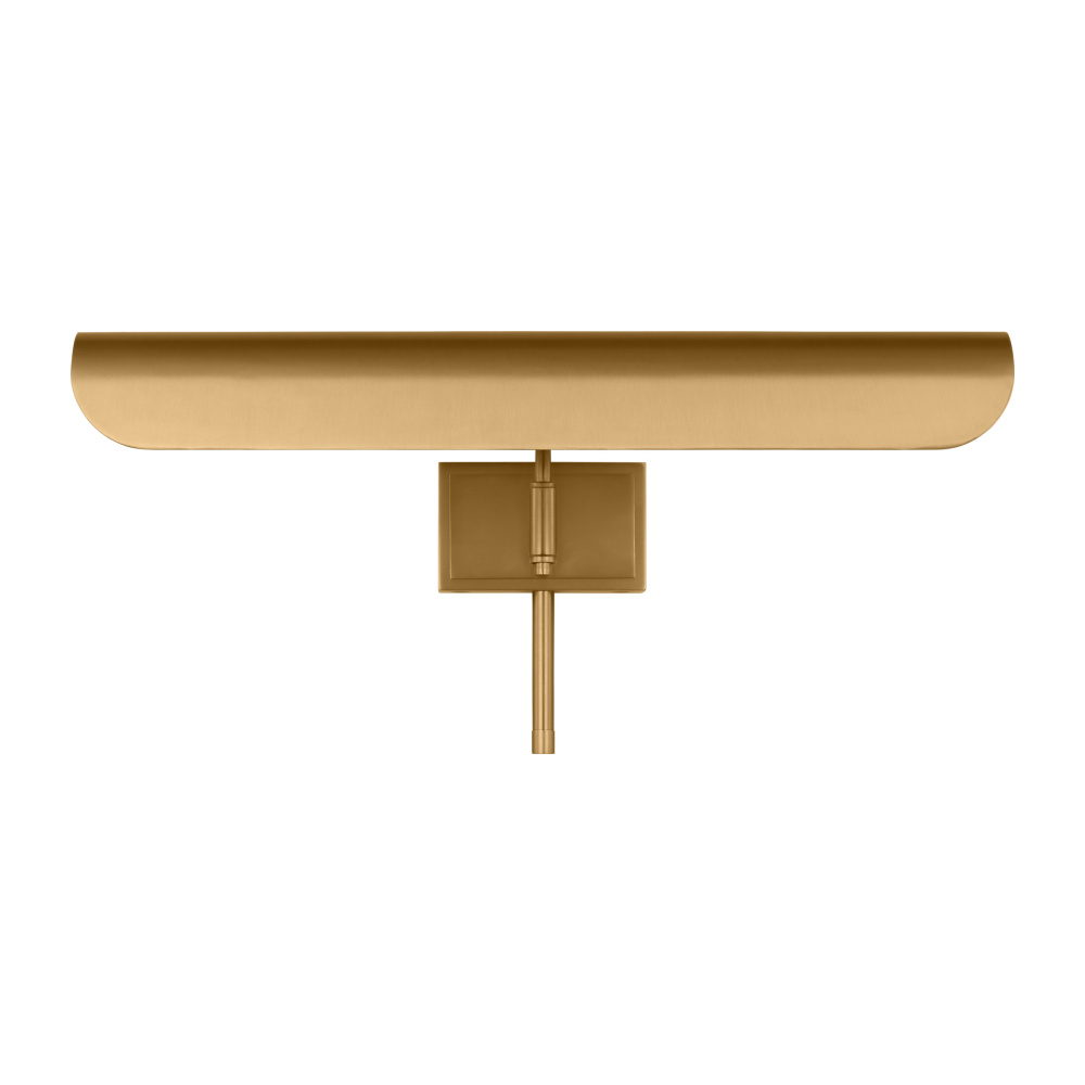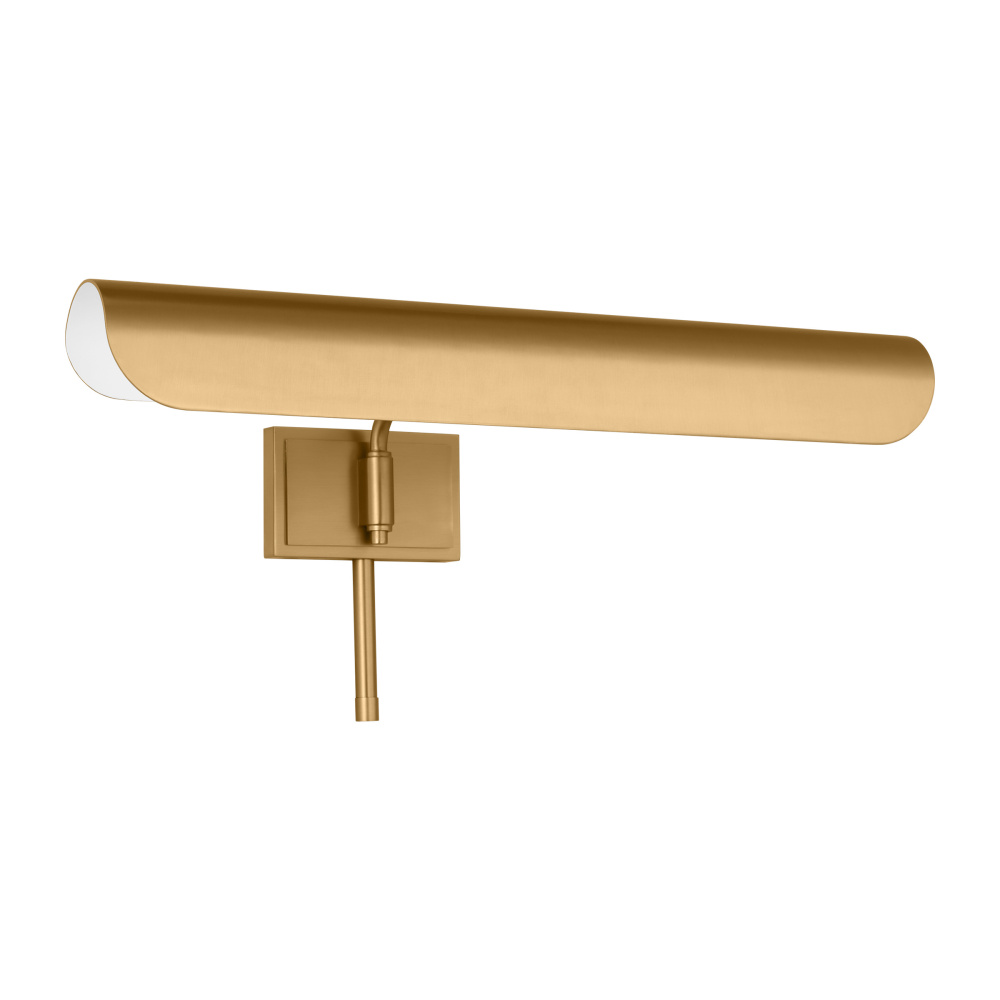 Inspired by a ship's outer hull, the Hull series by Chapman & Myers has a unique shade of these picture lights made from a single piece of metal bent into a cylindrical form. These picture lights have an open-ended design directing light both down and to the sides. A subtle horse saddle design and double barrel back-plate detail that pivots in the direction needed. Available in three sizes and two finish options.