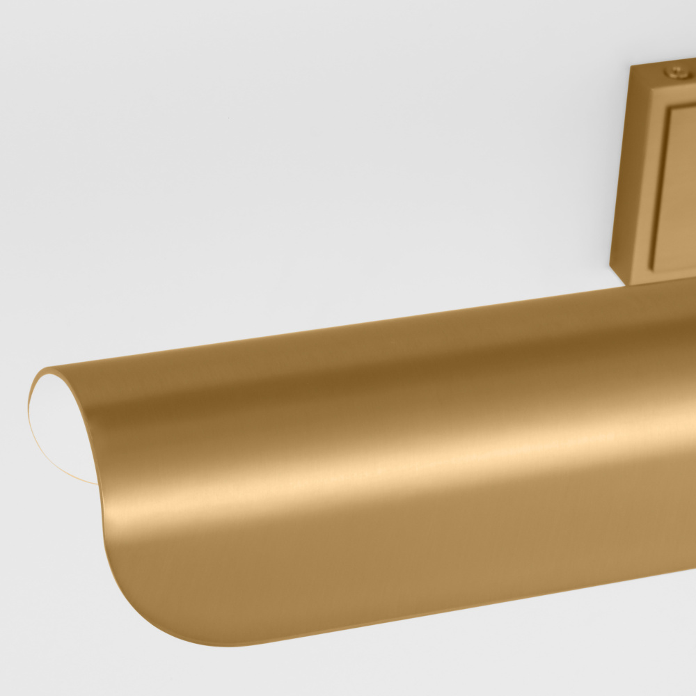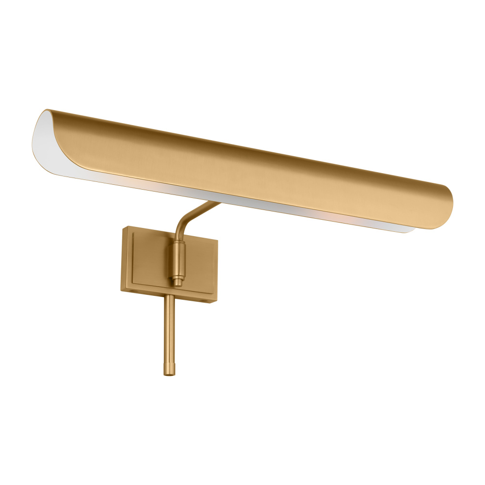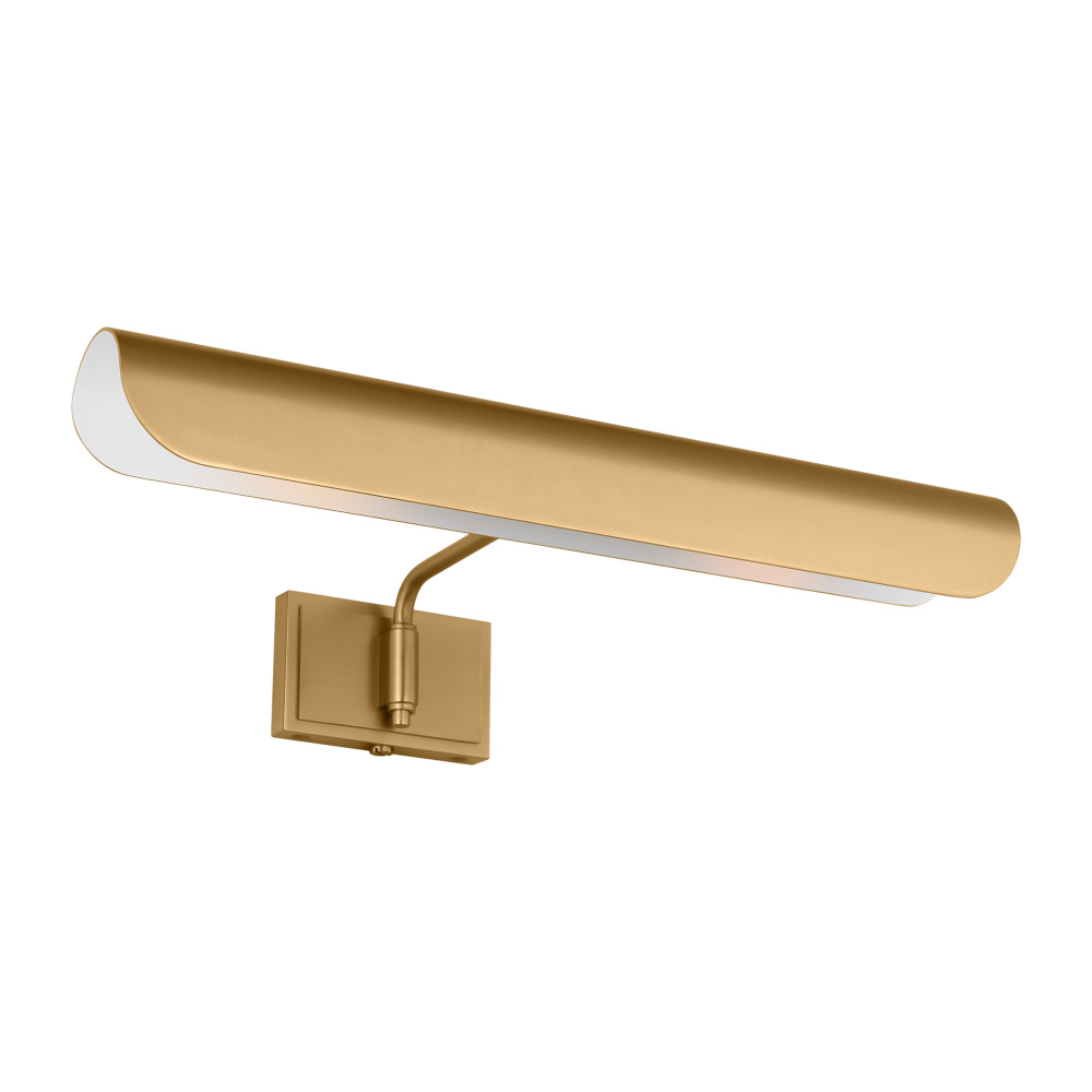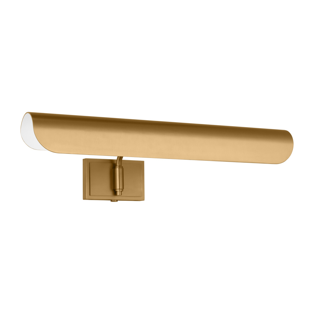 Inspired by a ship's outer hull, the Hull series by Chapman & Myers has a unique shade of these picture lights made from a single piece of metal bent into a cylindrical form. These picture lights have an open-ended design directing light both down and to the sides. A subtle horse saddle design and double barrel back-plate detail that pivots in the direction needed. Available in three sizes and two finish options.