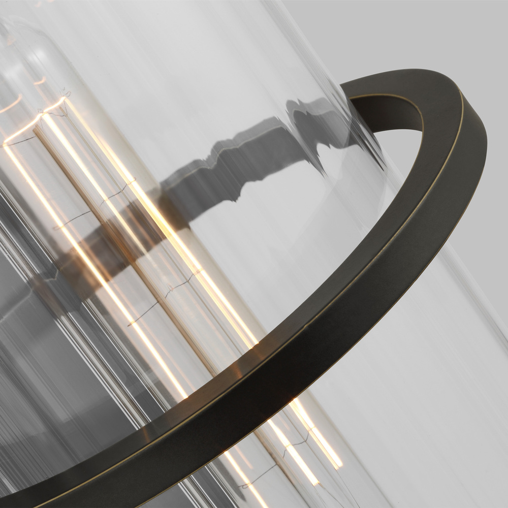 Clear fluted glass shades give the Alcona series a refined industrial look. The elegant square backplate and metal center ring provide a floating glass effect. The Alcona one light outdoor pendant fixture creates a warm and inviting welcome presentation for your home's exterior. Available in a handsome Black or Antique Bronze finish.