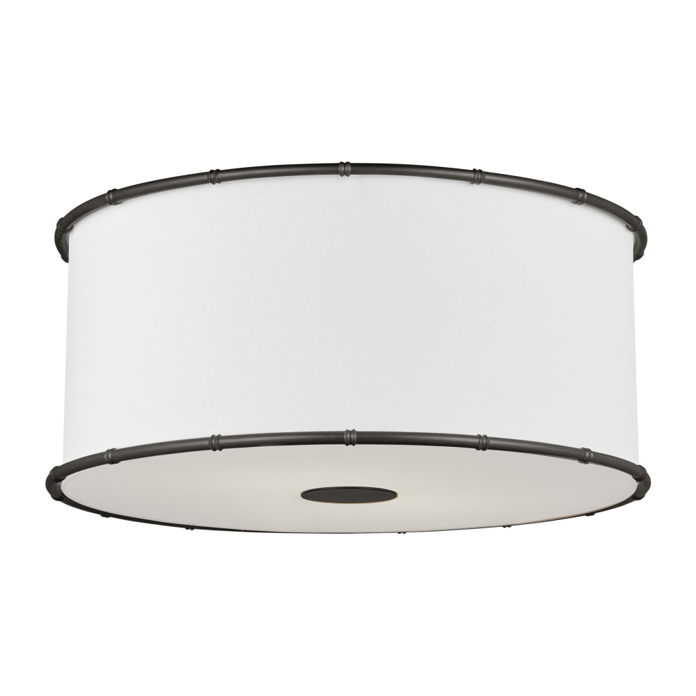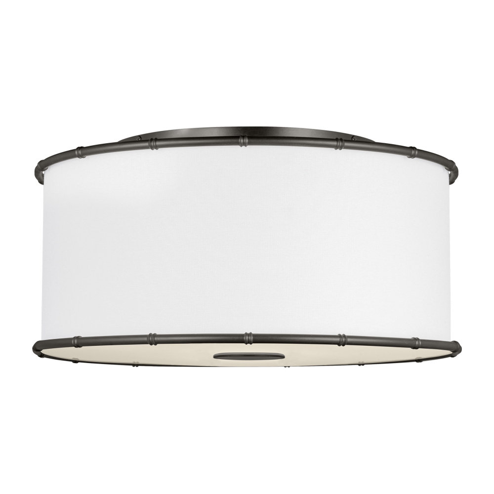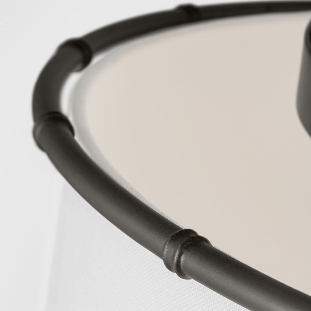 Crafted with Steel in a Aged Iron finish with silk screen white inside clear outside glass diffuser and white linen fabric shade