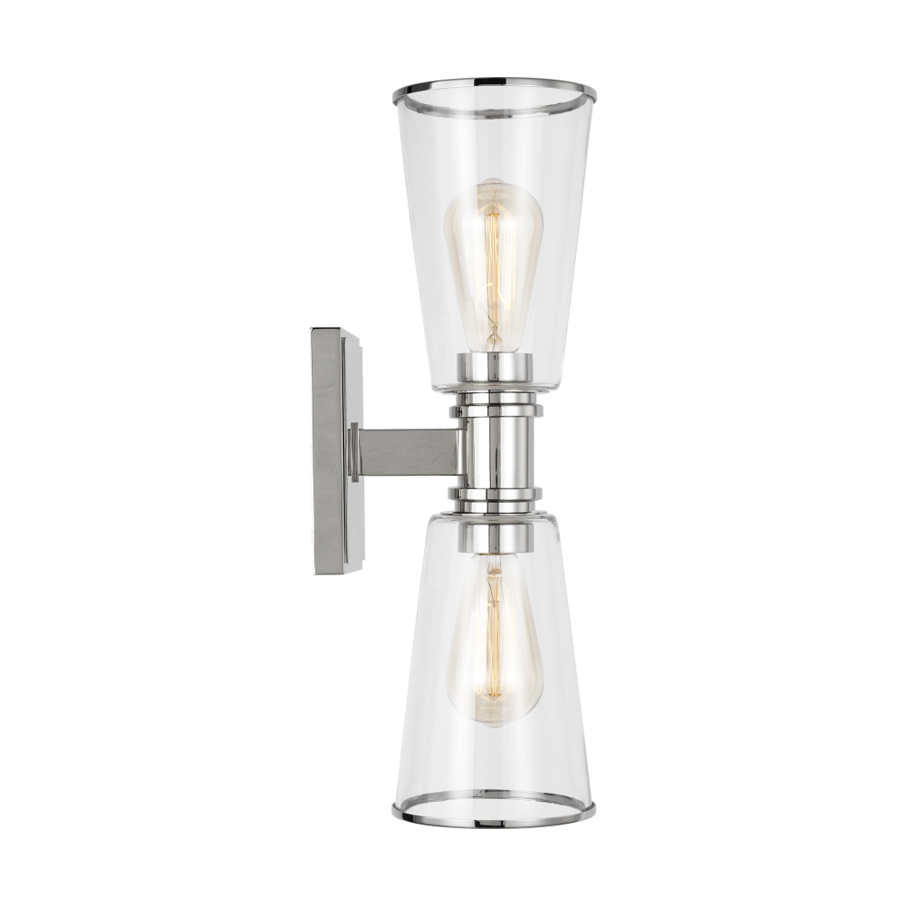 Designed by Chapman & Myers, the Alessa two light wall sconce in polished nickel is a Simple glass bathroom collection with rectangular metal arms and tapered clear glass shades. The conical clear glass shades replicate and frame the shape of the inner filament bulb. Each shade is supported by a rectangular metal arm and is capped with a thin metal rim.