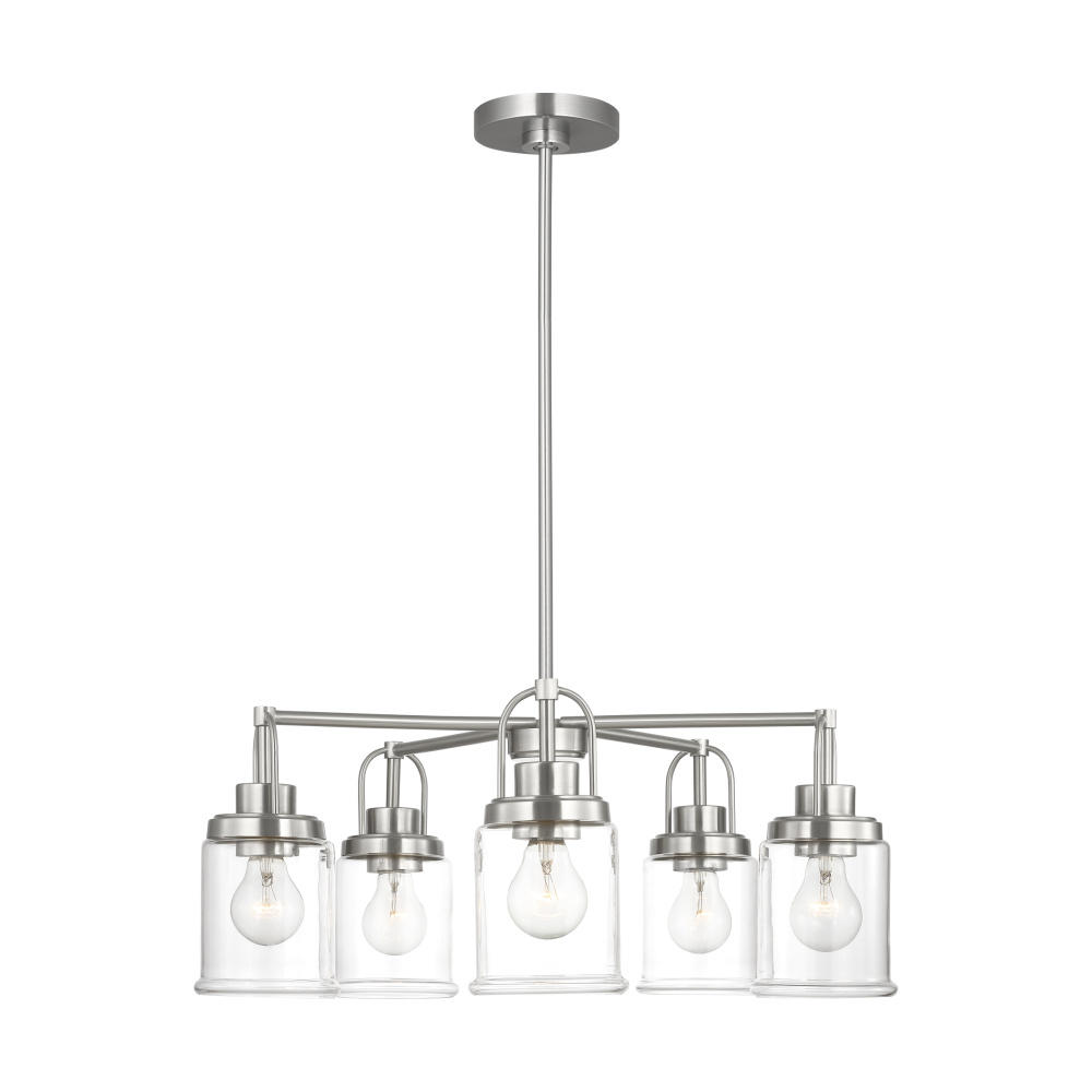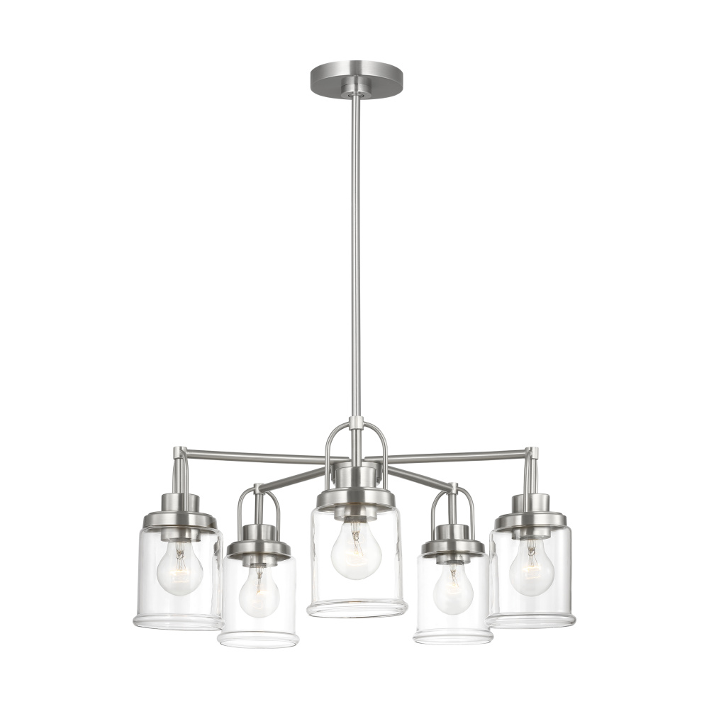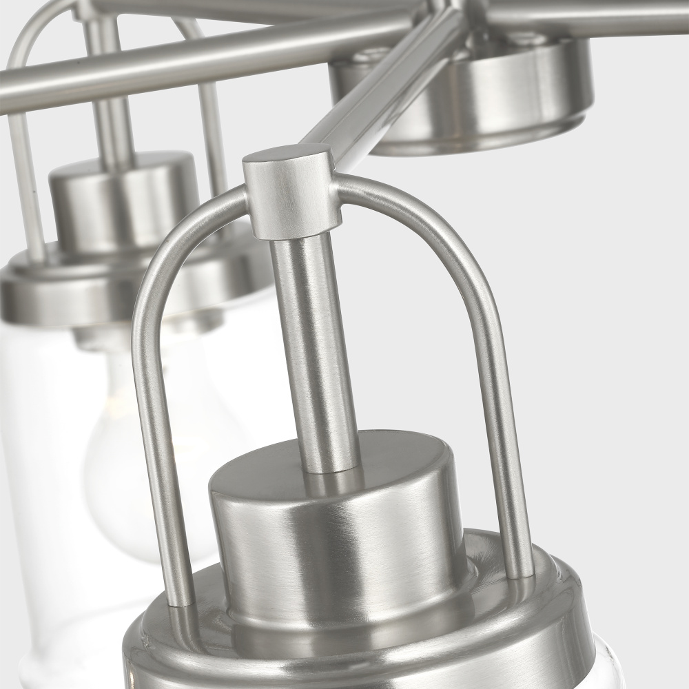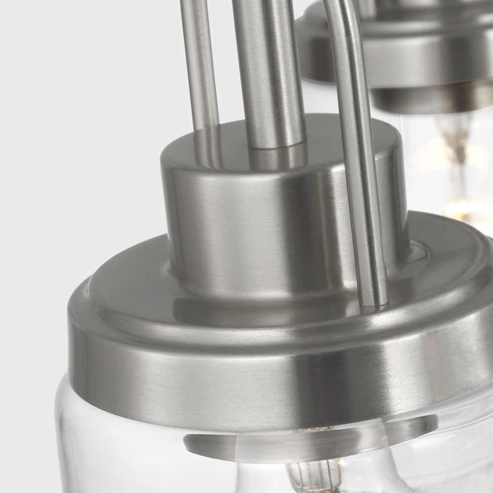 Crafted with Steel in a Brushed Nickel finish with clear glass shades