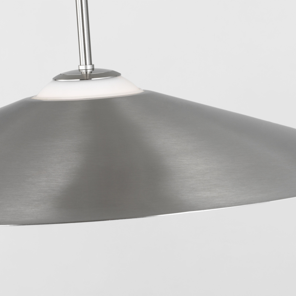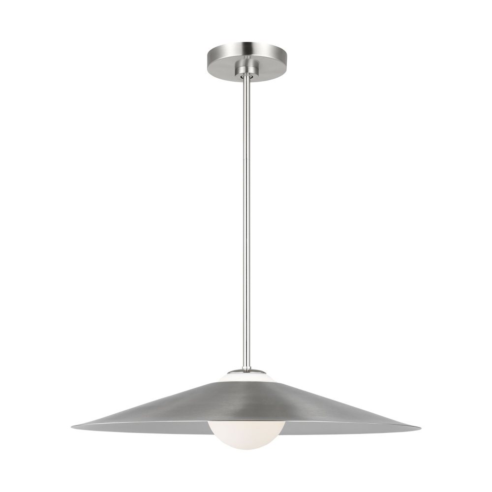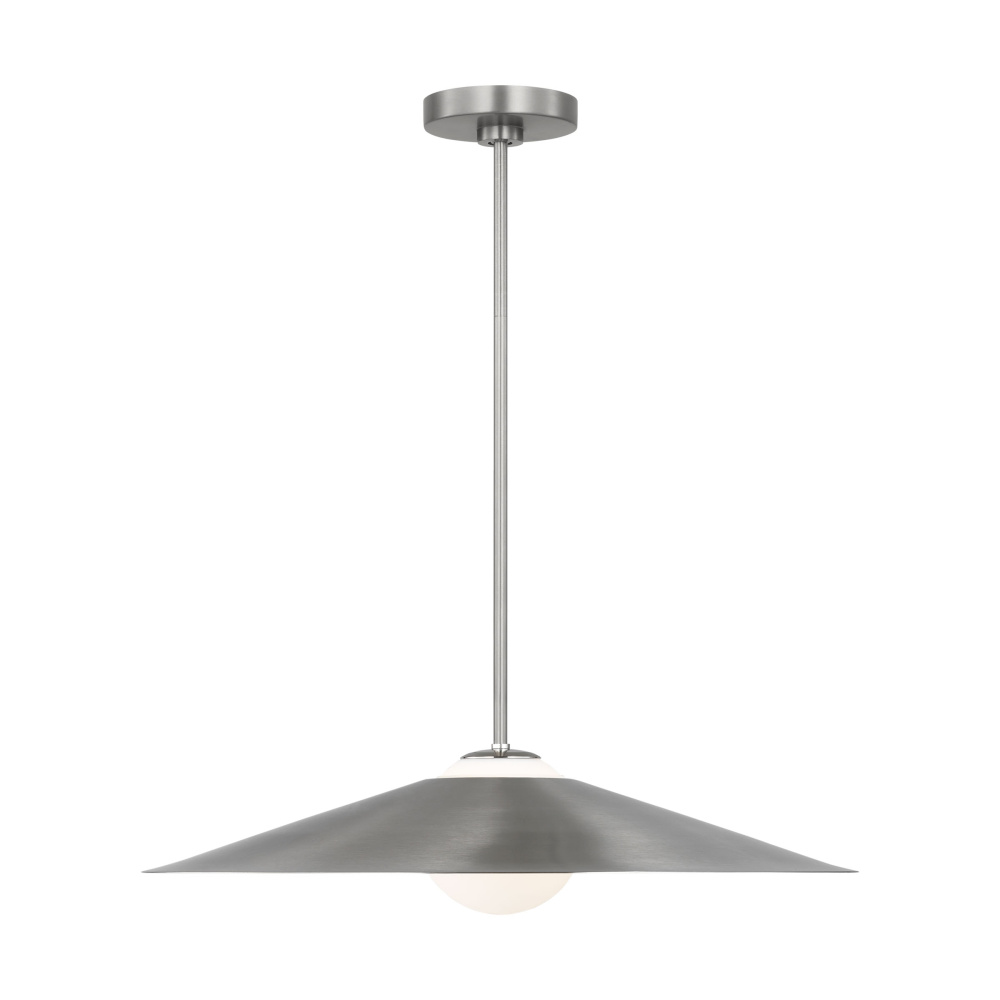 Crafted with Steel in a Brushed Nickel finish with brushed nickel steel shade and white opal etched glass shade