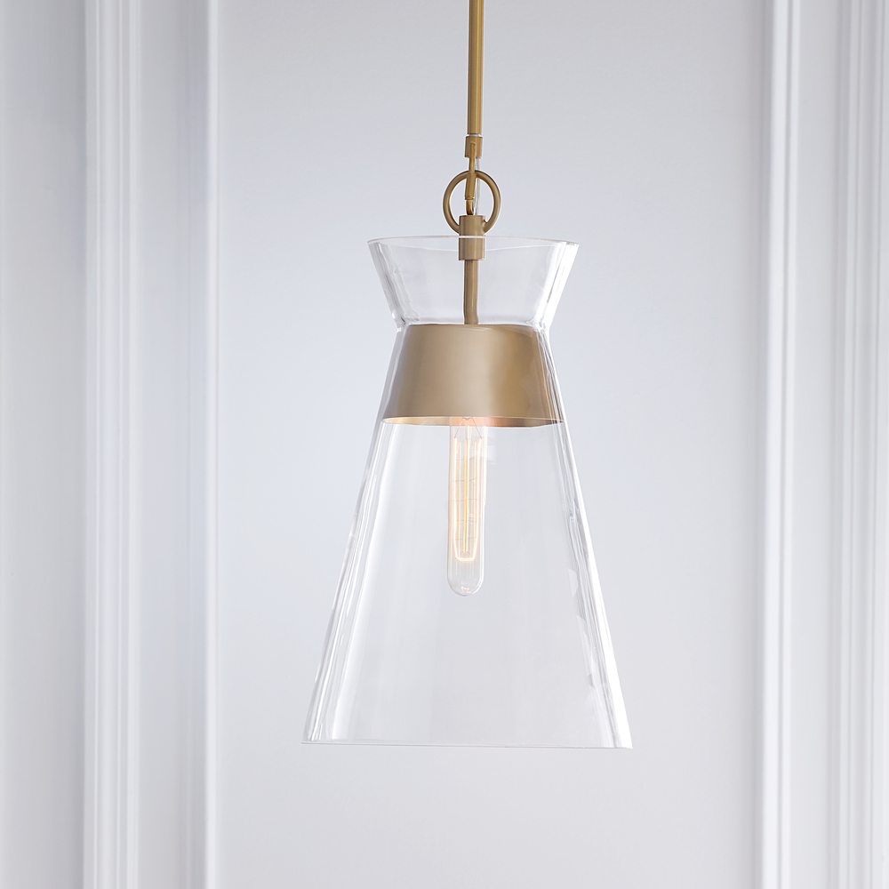 The Atlantic series from Chapman & Myers for Visual Comfort Studio Collection features globe and conical Clear Glass pendants paired with rich Burnished Brass and pure Polished Nickel hardware; these work well singularly or in multiples to elevate any room. The lamping suspends from the center, and appears floating within the Clear Glass shade. Coordinating table lamps feature white linen shades and lend a bright, cozy ambiance to any space.