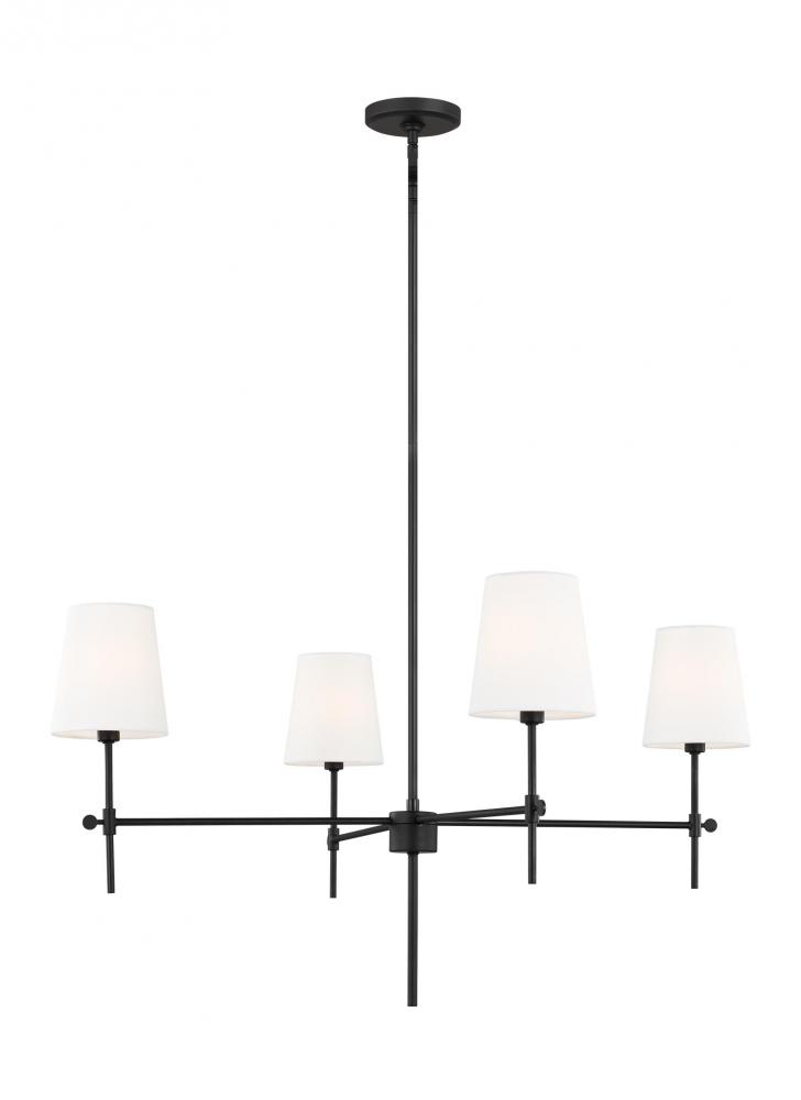 The Baker four light single tier chandelier in midnight black provides abundant light to your home, while adding style and interest. A lantern-like design with curved arms connecting to a cube-shaped frame