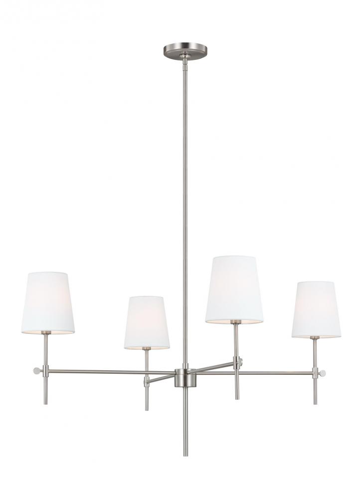 The Baker four light single tier chandelier in brushed nickel is the perfect way to achieve your desired fashion or functional needs in your home. A lantern-like design with curved arms connecting to a cube-shaped frame