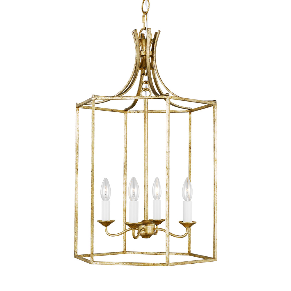 The Bantry House lanterns from Alexa Hampton sport an open, airy frame with an elegant, birdcage-like design. Slim, straight metal bars swoop down from the canopy to align around the main drum-shaped frame. The central column suspends an inner, candelabra structure, with four curved light arms, simple candle cups and a globe canopy. Bantry House four light indoor pendant in antique gild provides abundant light to your home, while adding style and interest.