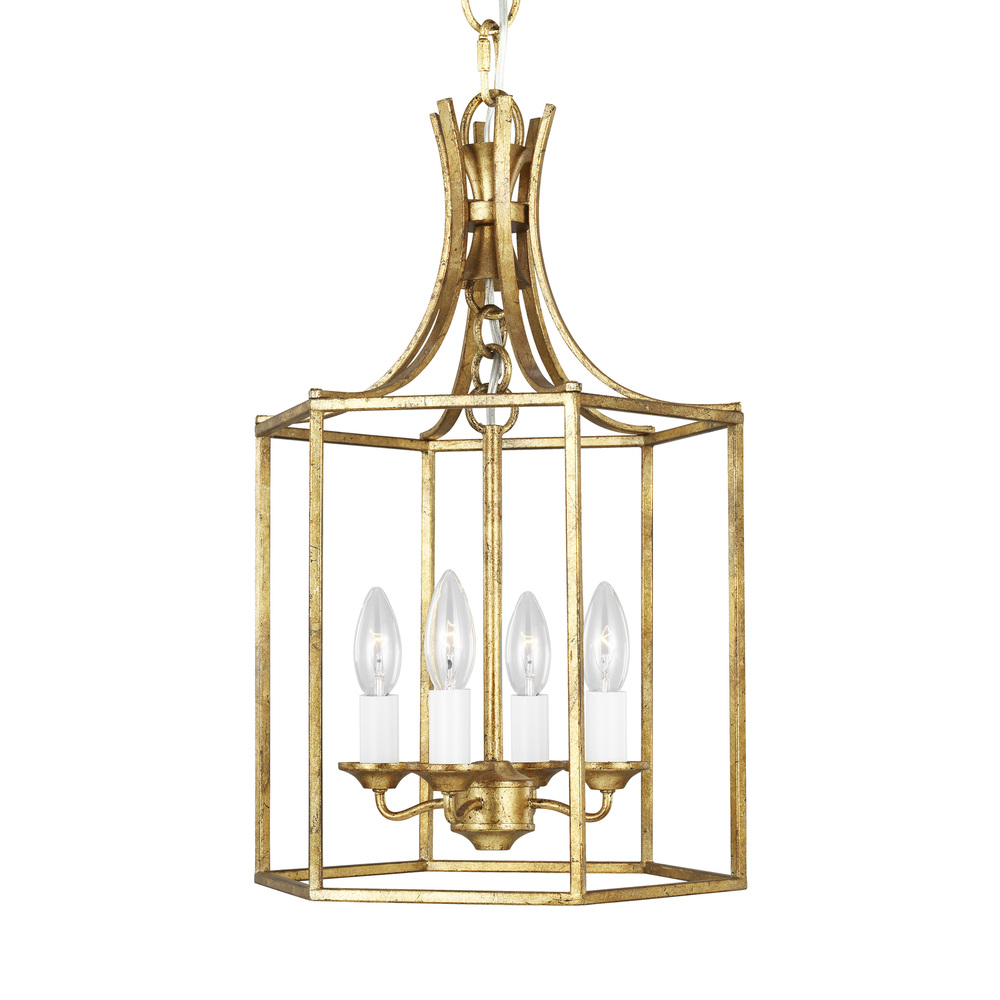 The Bantry House lanterns from Alexa Hampton sport an open, airy frame with an elegant, birdcage-like design. Slim, straight metal bars swoop down from the canopy to align around the leading drum-shaped edge. The central column suspends an inner candelabra structure with four curved light arms, simple candle cups, and a globe canopy. Bantry House's four indoor light pendants in antique gild provides abundant light to your home while adding style and interest.