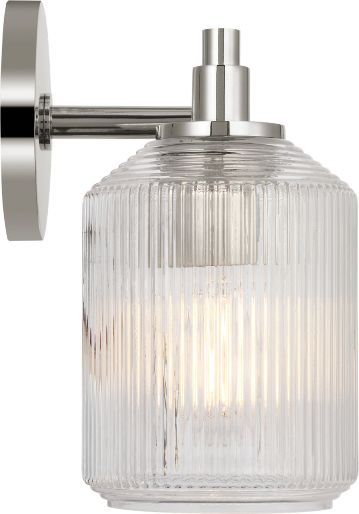 Inspired by a vintage piece of factory glass, the Barstow 15" Vanity by Chapman & Myers balances industrial heritage With modern refinement. The ribbed clear glass shade, defined by vertical and horizontal cuts, offers a jewel-like texture that catches and diffuses light With elegance. A streamlined metal frame enhances the fixture’s clean lines, making the 15" profile perfect for single vanities, guest bathrooms, or layered installations. Barstow’s thoughtful detailing and timeless simplicity elevate everyday interiors With subtle architectural presence.