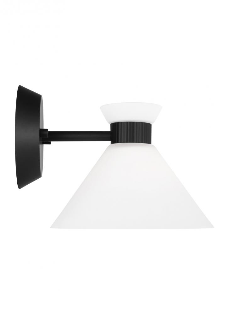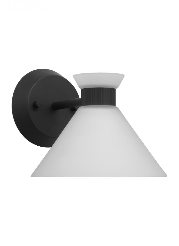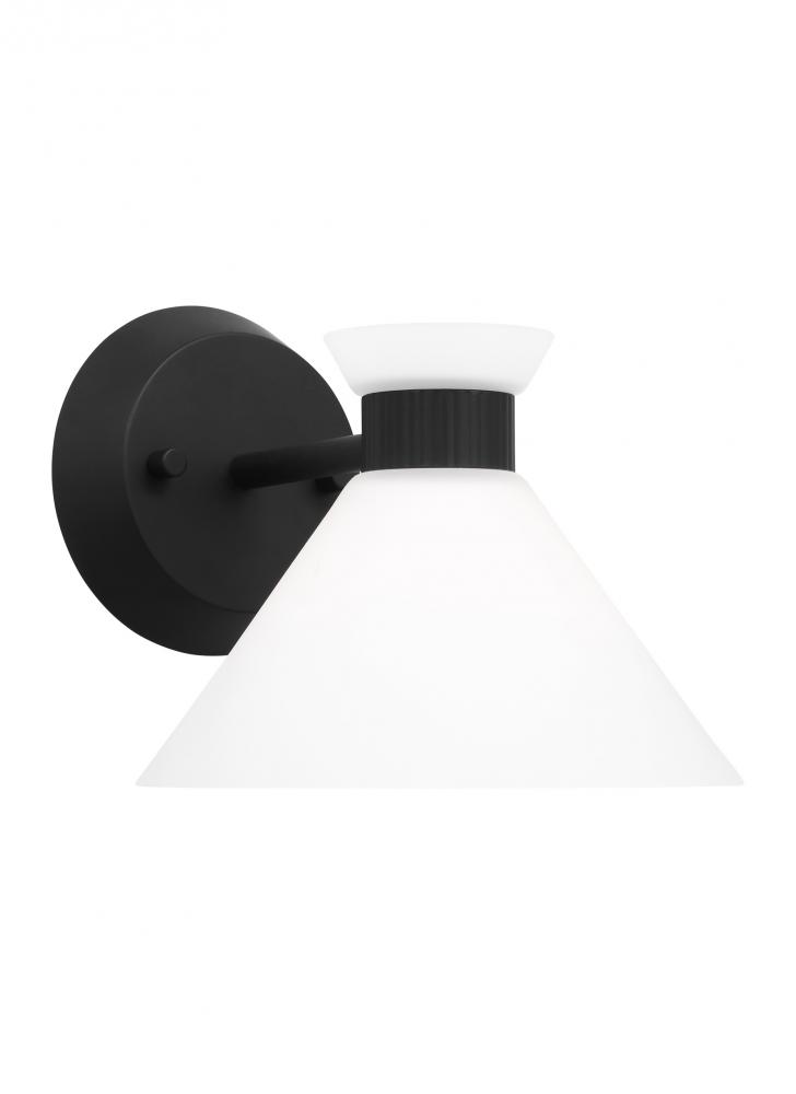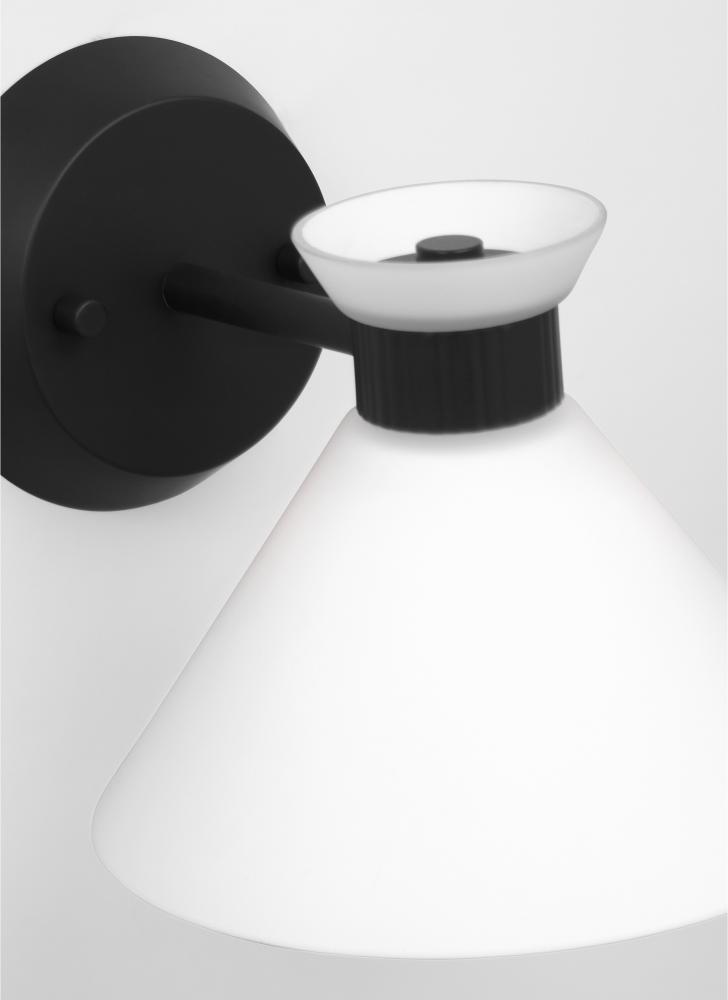 Inspired by playful mid-century modern design, the Drew & Jonathan Belcarra Small Sconce is accentuated by a flared glass shade with ribbed metal details and etched white glass that bestows an almost whimsical touch to the clean design. Available in three finishes, Brushed Steel, Midnight Black, and Satin Brass, the Belcarra looks great on its own or installed above a bathroom vanity. This fixture may be mounted in the up or down position, and is cETL listed for damp locations, making it the perfect lighting solution for any space.