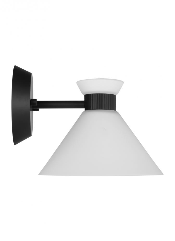 The flared glass shade with ribbed metal details and etched white glass of this light bring clean lines and classic mid-century modern design to any wall or bath space