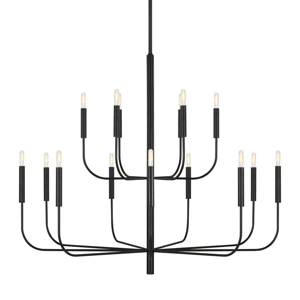 The Brianna fifteen light multi-tier chandelier in aged iron has graceful, seamless curvature and elongated tubular arms that lend fluidity and modern appeal to this classic minimalist silhouette. Also available in Polished Nickel finish , this chandelier comes in six, nine and fifteen light options. Includes one six-inch and four twelve-inch downrods to customize length. Canopy: 5.5 inch diameter. Damp location rated.