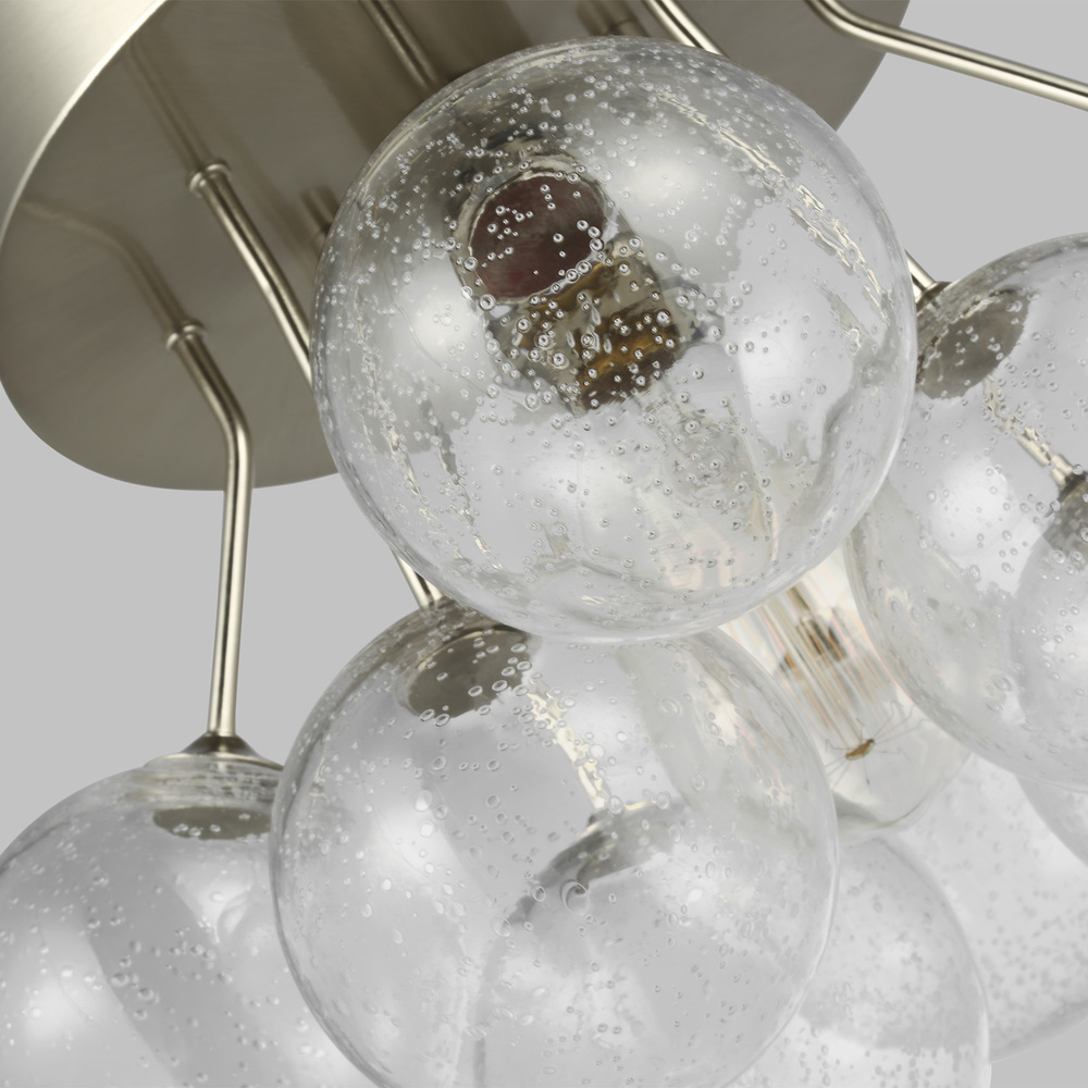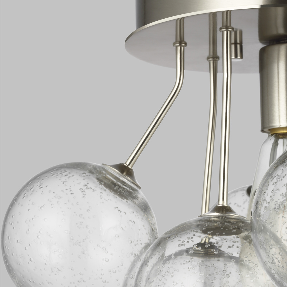 The Bronzeville one light semi flush fixture in brushed nickel provides abundant light to your home, while adding style and interest. Bronzeville brings a daring, upscale element of mid-century modern design to any space. Hand blown, Seeded Glass globes encircle warm, glowing, filament lamps, diffusing the light to create a serene ambiance of light and shadow. Available in two finishes.