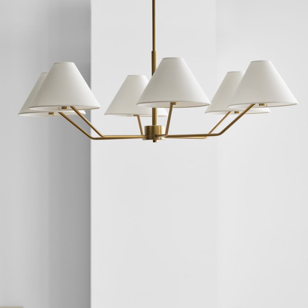Designed by Drew & Jonathan Scott, the Burke series is a contemporary interpretation of a classic mid-century style. The bent arm and concealed socket highlight the minimalist aesthetic allowing this to be placed in a variety of spaces. A cone-shaped white fabric shade tops the bulb exuding a soft, ambient glow that is perfect for kitchens, dining rooms, or living rooms.
