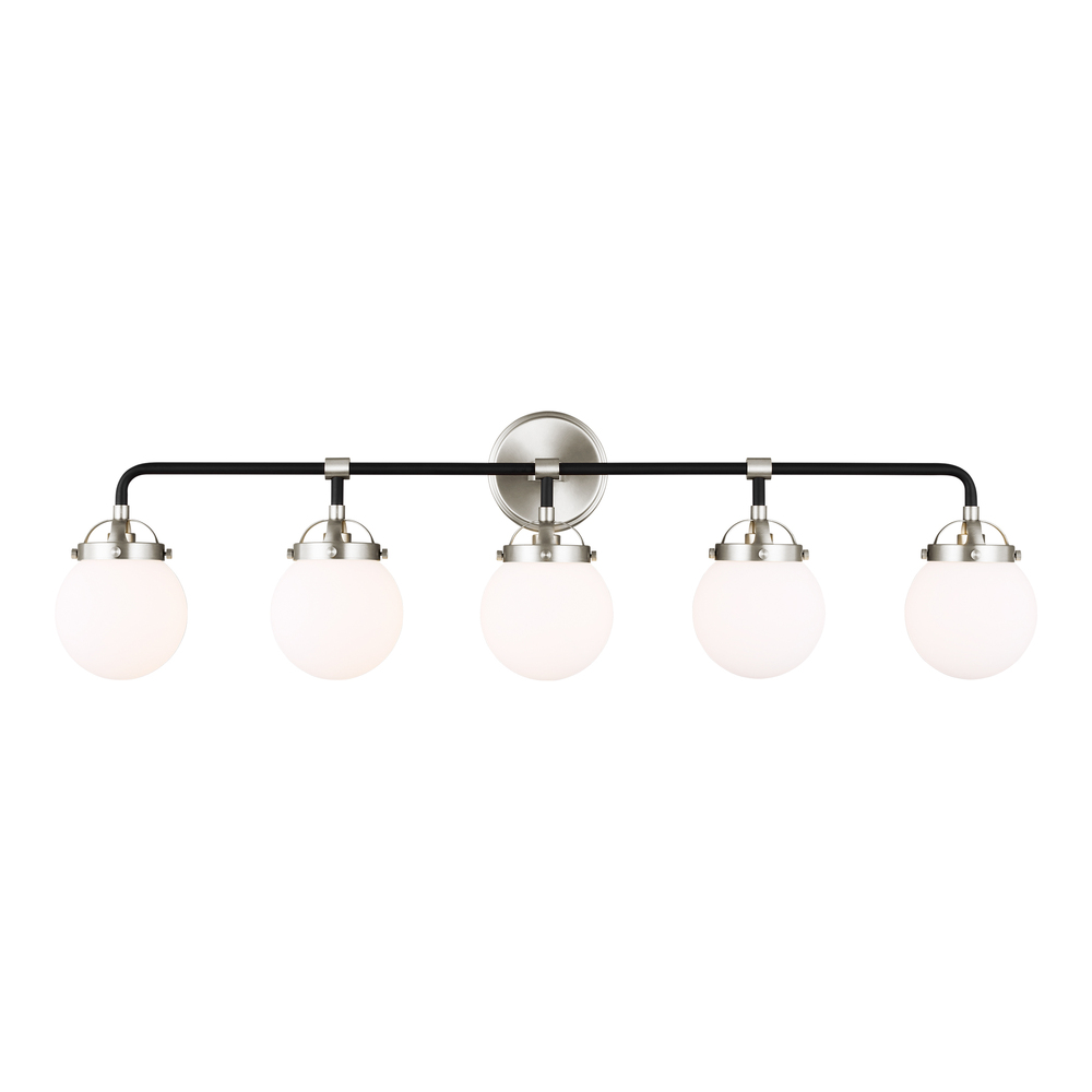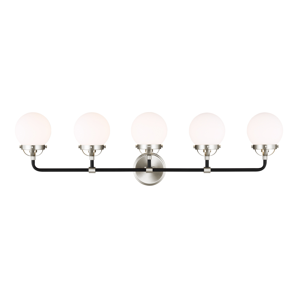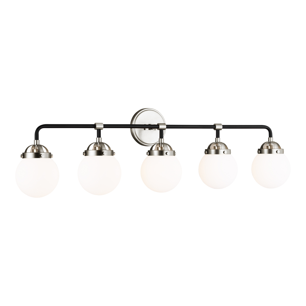 The Cafe five light vanity fixture in brushed nickel provides abundant light for your bath vanity, while adding a layer of today's style to your interior design. Â Handsome two-tone finish and white glass globe shades.