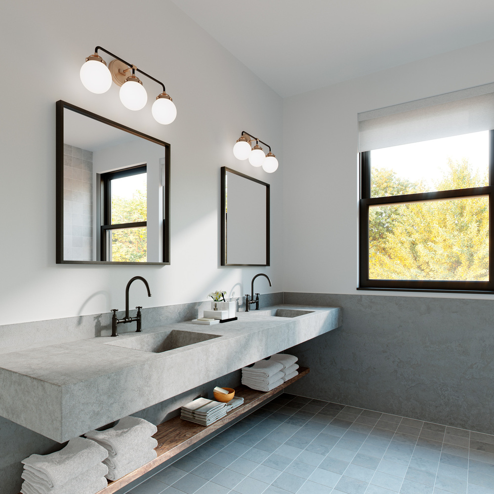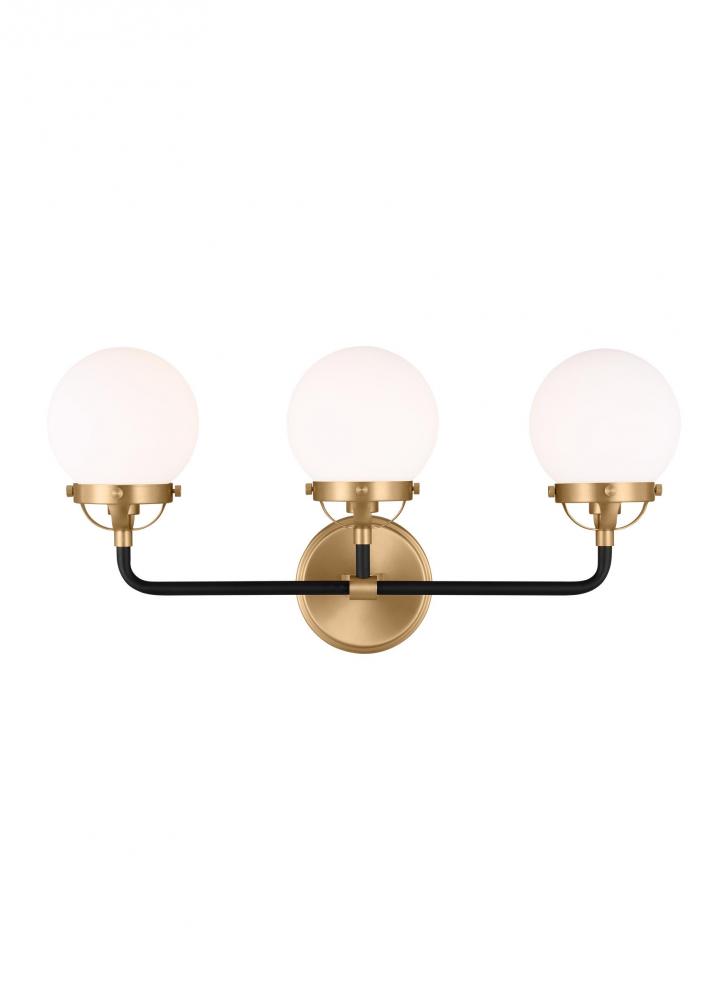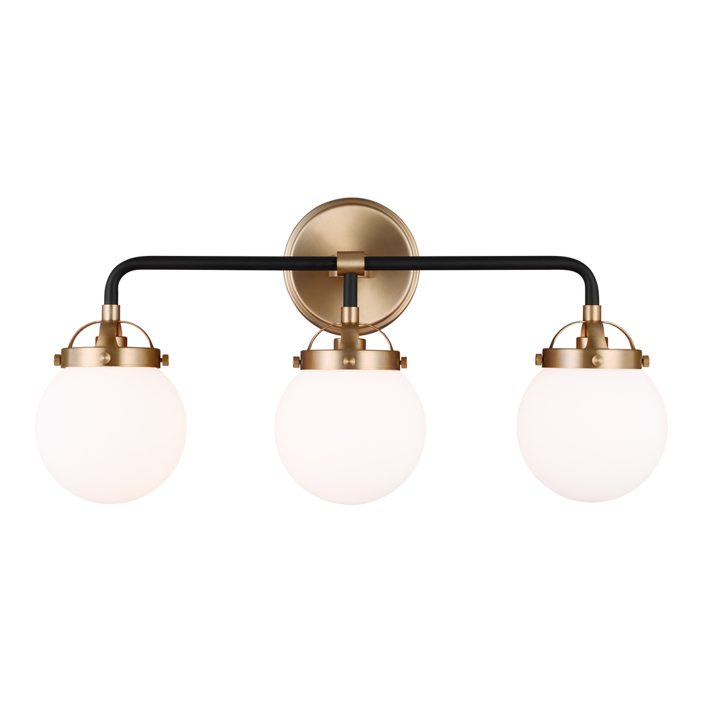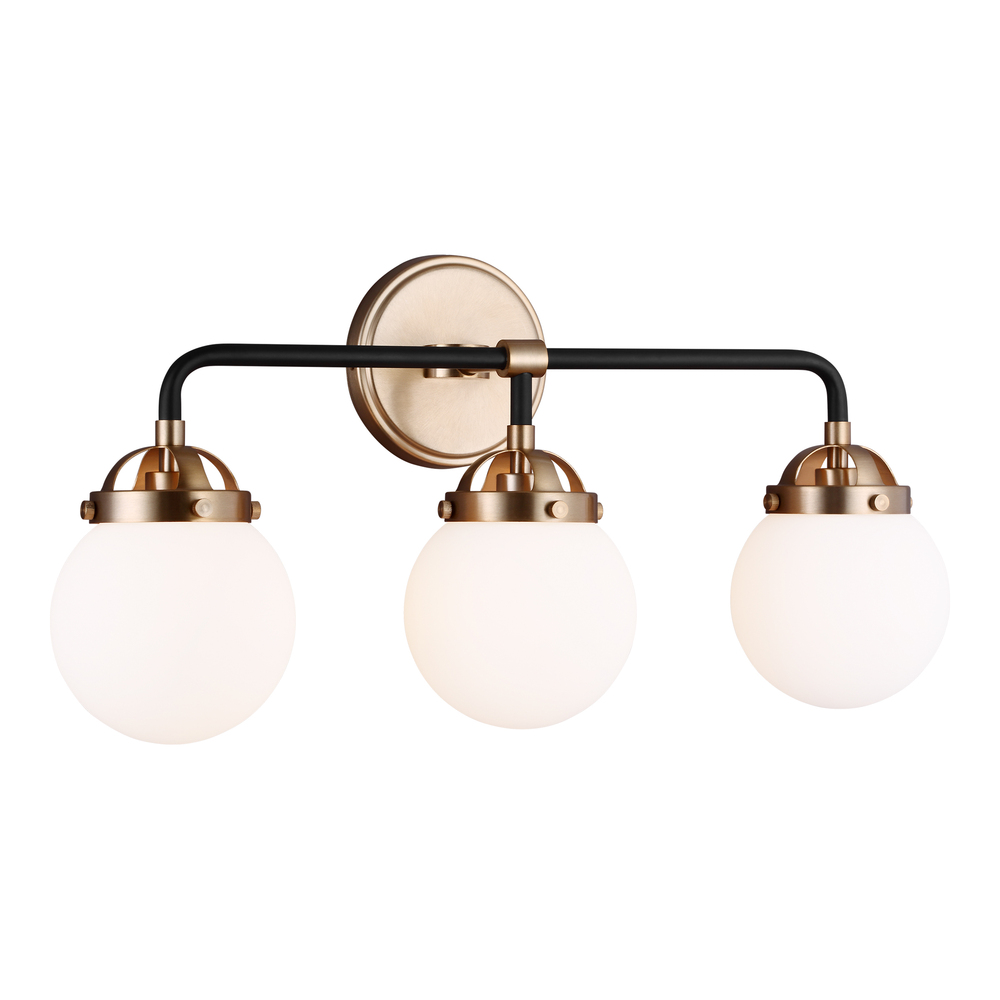 The Cafe three light vanity fixture in satin brass offers shadow-free lighting in your powder room, spa, or master bath room. Â Handsome two-tone finish and white glass globe shades.