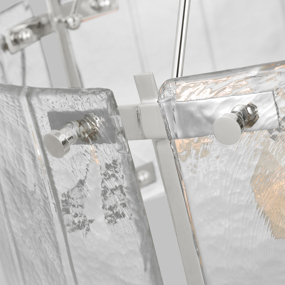 Clean and crisp, The Calvert series by Alexa Hampton is the perfect blend of function and beauty. Light flows freely through the Clear Textured glass shade while the rounded corners bring out the softness. Available as a medium chandelier with Aged Iron, Burnished Brass, or Polished Nickel finishes.