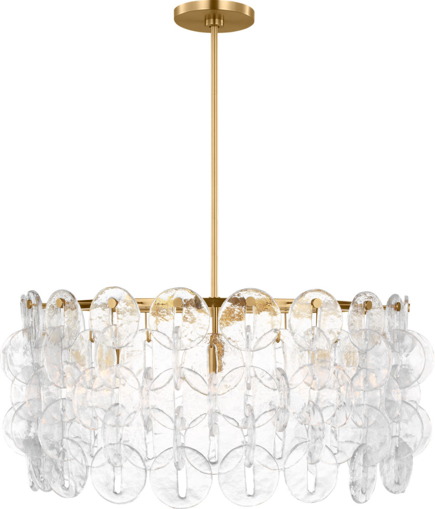 The Candace 32" Chandelier by Kate Spade is a bold expression of the collection’s sculptural elegance and material richness. A layered cascade of interlocking textured glass discs creates a sense of movement and depth, while diffusing light With a soft, radiant glow. The generous 32" scale makes it ideal for dining rooms, great rooms, foyers, and primary bedrooms, where its luminous presence becomes a focal point. With its refined geometry and thoughtful detailing, this chandelier brings a striking yet balanced presence to larger spaces.