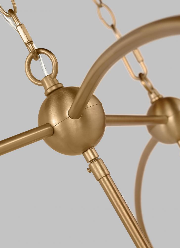 The Charleston seven light indoor pendant in Satin Brass is crafted from metal, its frame is steeped in sophistication with an openwork silhouette accented by a curved top. Candelabra-inspired lights sit inside, highlighted by glass panels for a warm and even gleam.