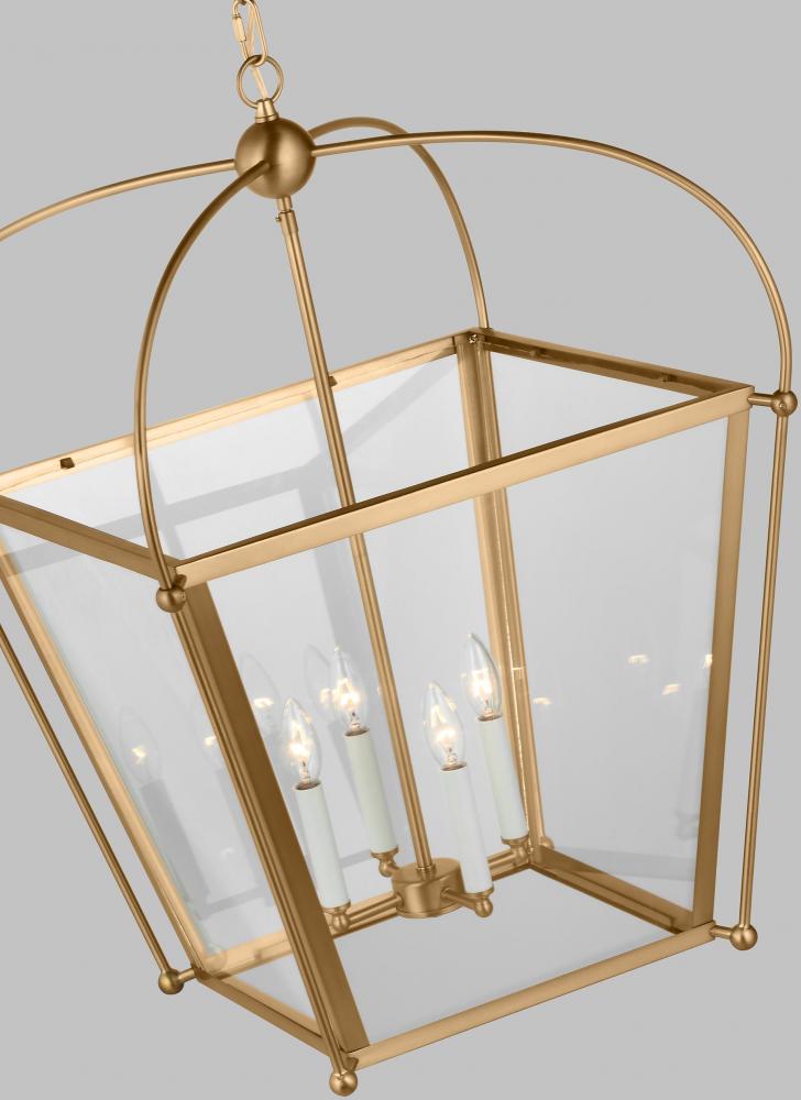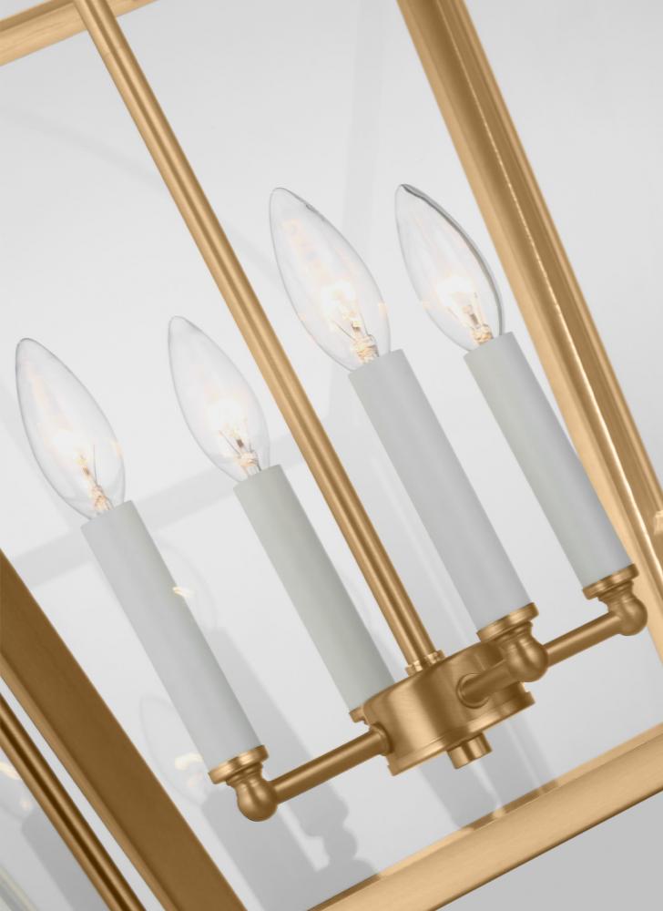 The Charleston four light indoor pendant in satin brass provides abundant light to your home, while adding style and interest. A lantern-like design with curved arms connecting to a cube-shaped frame