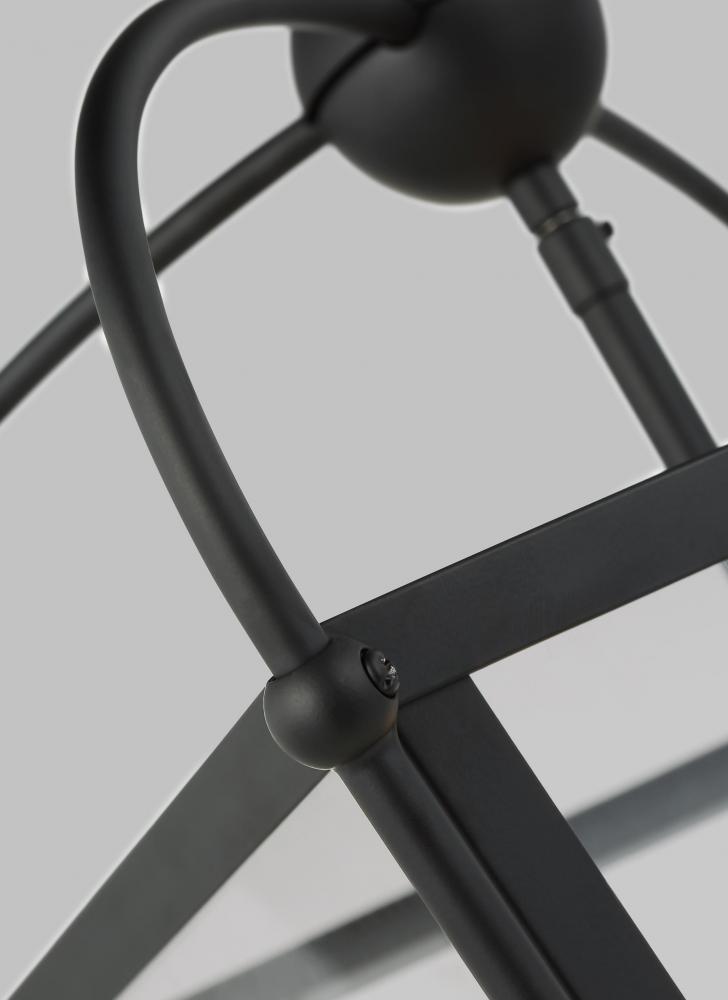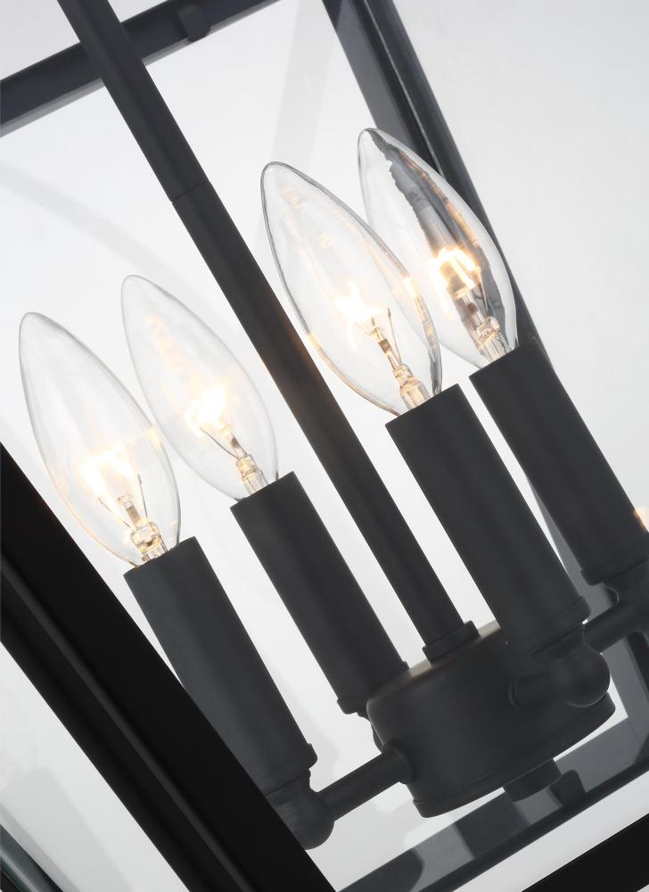 The Charleston four light indoor pendant in Midnight Black is crafted from metal, its frame is steeped in sophistication with an openwork silhouette accented by a curved top. Candelabra-inspired lights sit inside, highlighted by glass panels for a warm and even gleam.