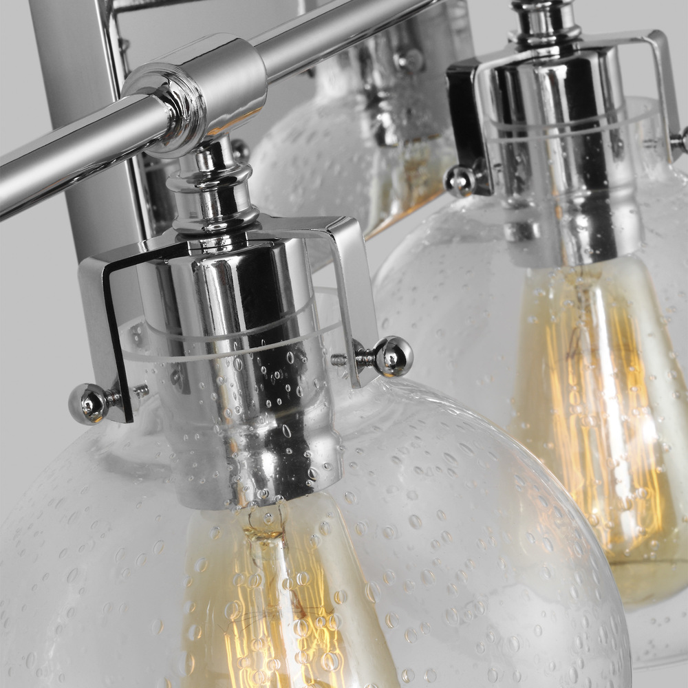 Clara features Clear Seeded glass shades that subtly diffuse the lamping while allowing the exposed bulb to be a central design element of the fixture. Choose the look that is right for your space with four finish options: Burnished Brass, Chrome, Satin Nickel, Oil Rubbed Bronze or a two-toned finish of Textured Black with Chrome.