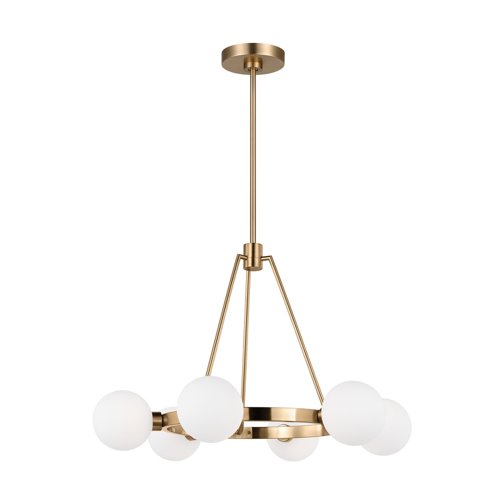 The Clybourn six light single tier chandelier in Satin Brass is an industrial yet minimalist design, making this fixture perfect for an eclectic living room or over a modern dining room table. Milk Glass gives the Clybourn series a more current look.