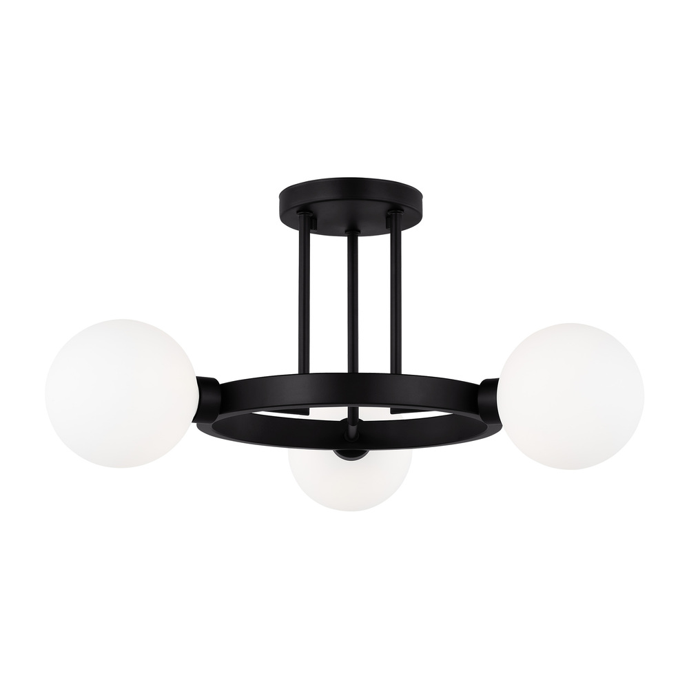 The Clybourn three light semi flush fixture in Midnight Black is an industrial yet minimalist design, making this fixture perfect for an eclectic living room or over a modern dining room table. Milk Glass gives the Clybourn series a more current look.