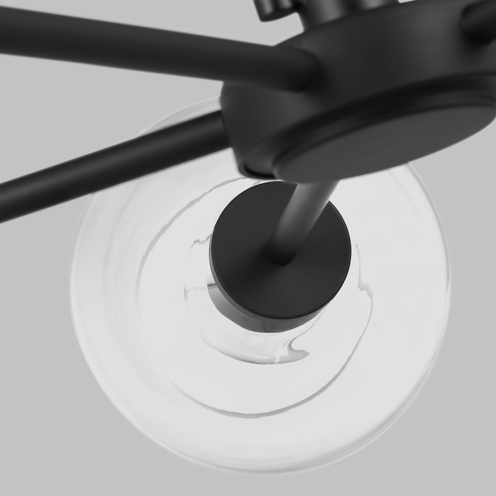 The Codyn five light single tier chandelier in Midnight Black is a contemporary take on a classic mid-century design. Clear glass shades with open-ended spheres accent the elongated keyhole strap detail, for a clean look. This minimalist collection relies on subtle details to create visual interest