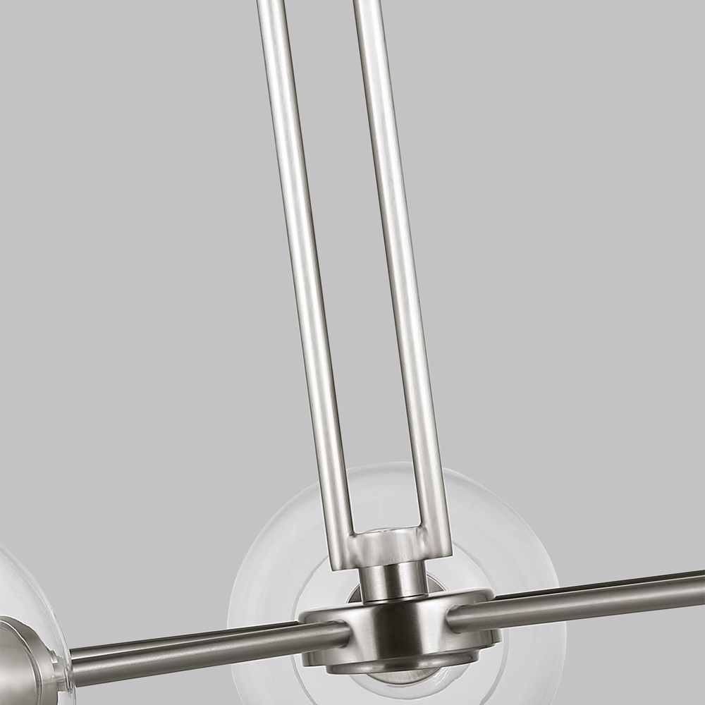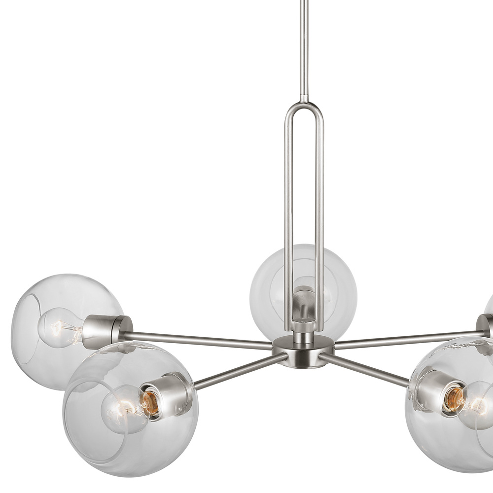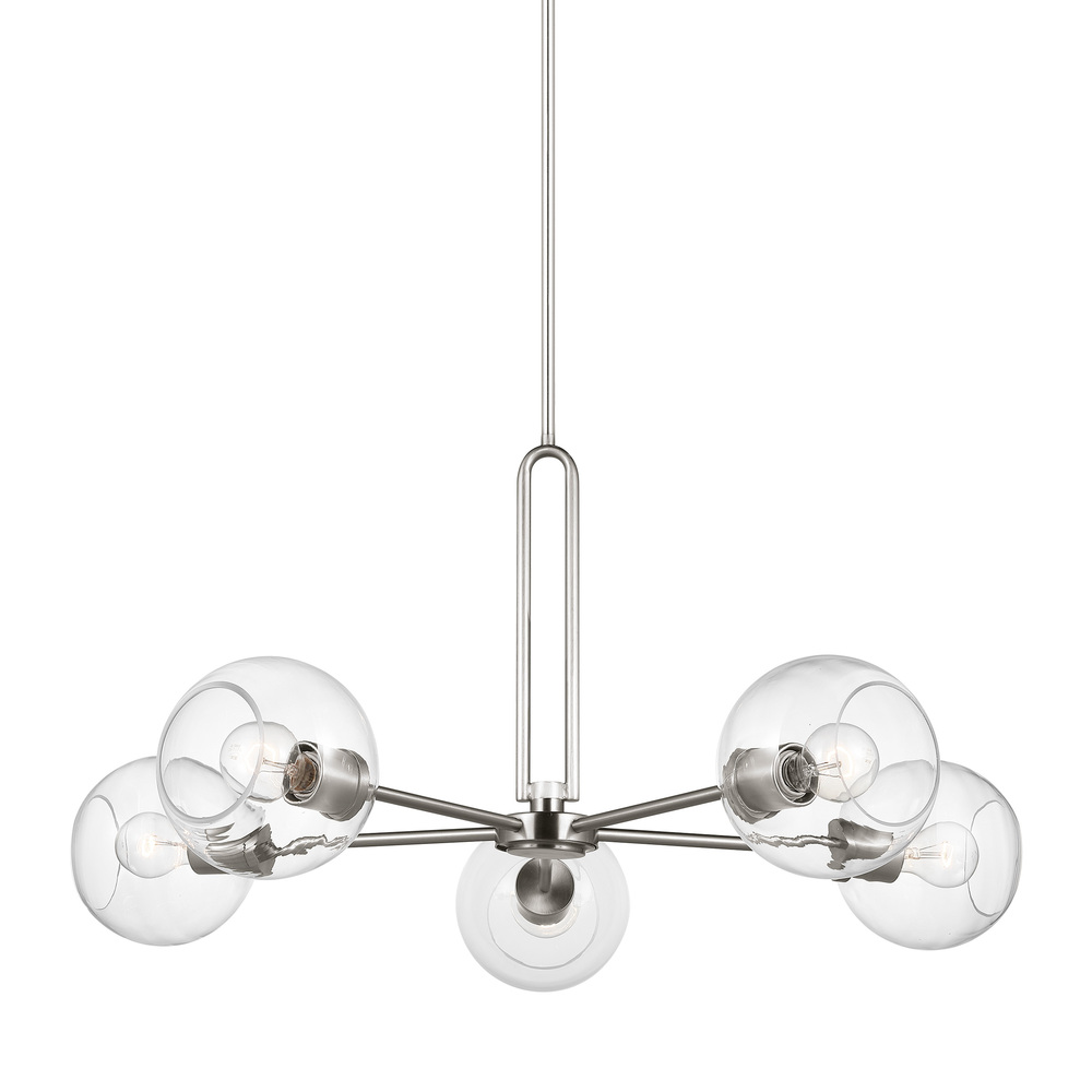 The Codyn five light single tier chandelier in brushed nickel silver is a contemporary take on a classic mid-century design. Clear glass shades with open-ended spheres accent the elongated keyhole strap detail, for a clean look. This minimalist collection relies on subtle details to create visual interest