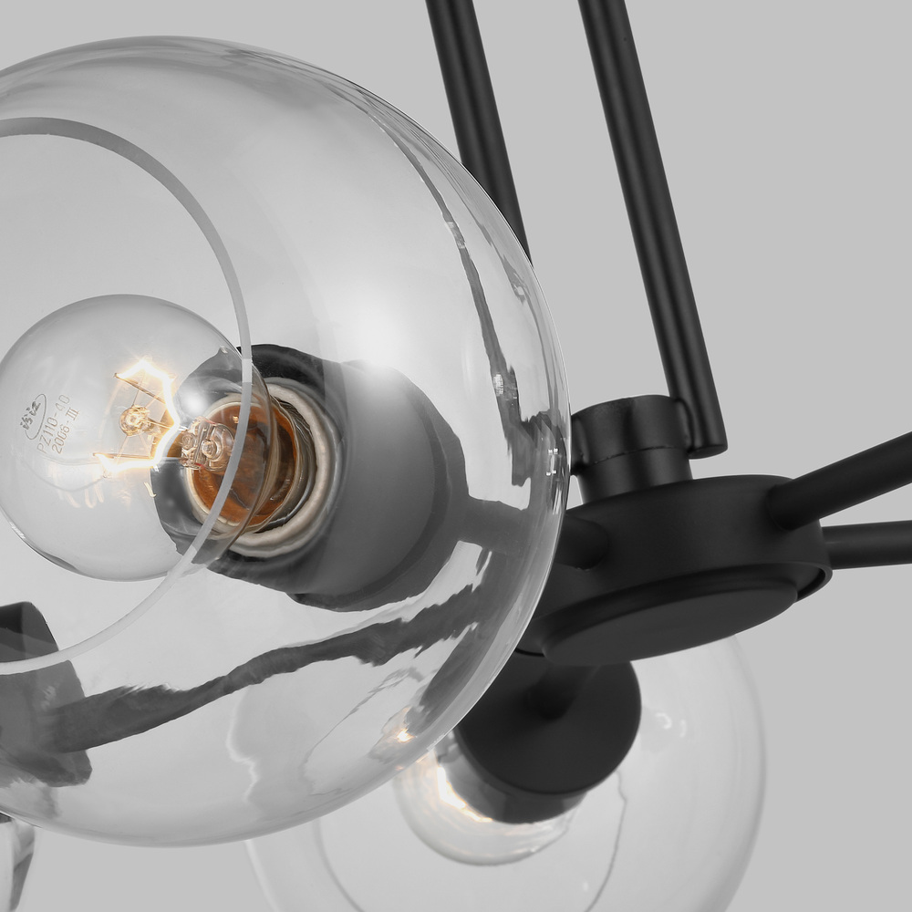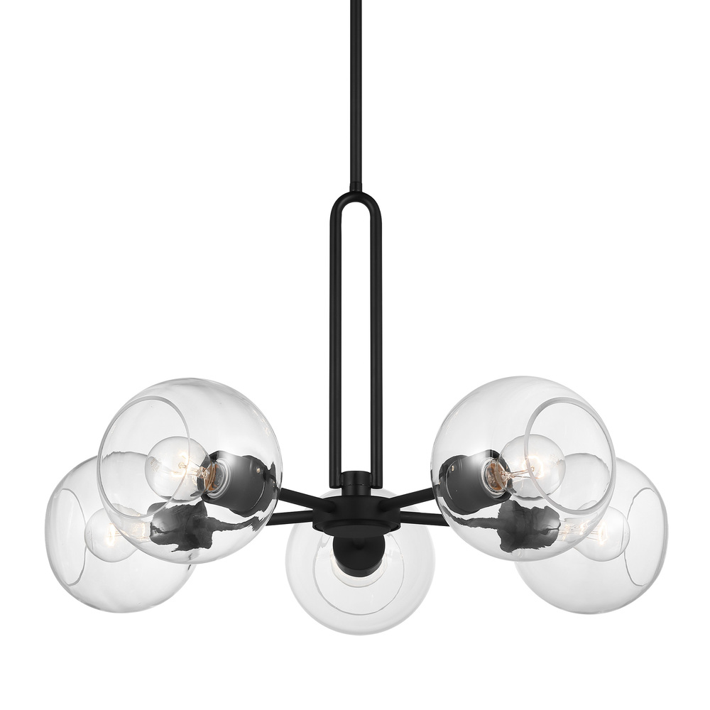 The Codyn five light single tier chandelier in Midnight Black is a contemporary take on a classic mid-century design. Clear glass shades with open-ended spheres accent the elongated keyhole strap detail, for a clean look. This minimalist collection relies on subtle details to create visual interest