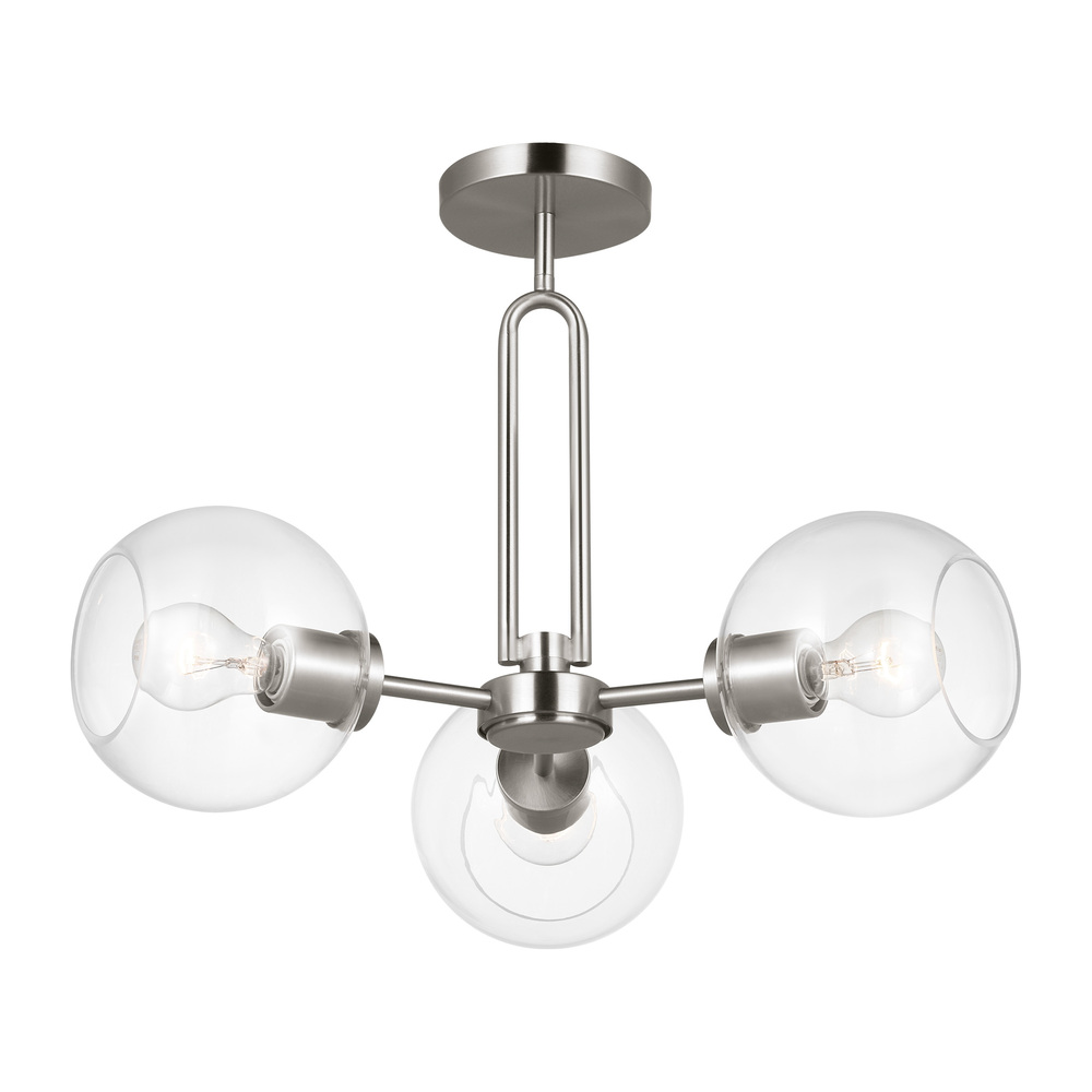 The Codyn three light semi flush fixture in brushed nickel silver is a contemporary take on a classic mid-century design. Clear glass shades with open-ended spheres accent the elongated keyhole strap detail, for a clean look. This minimalist collection relies on subtle details to create visual interest