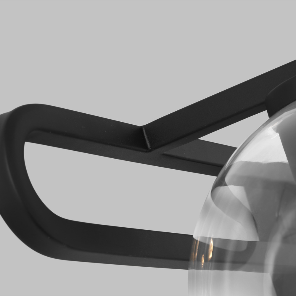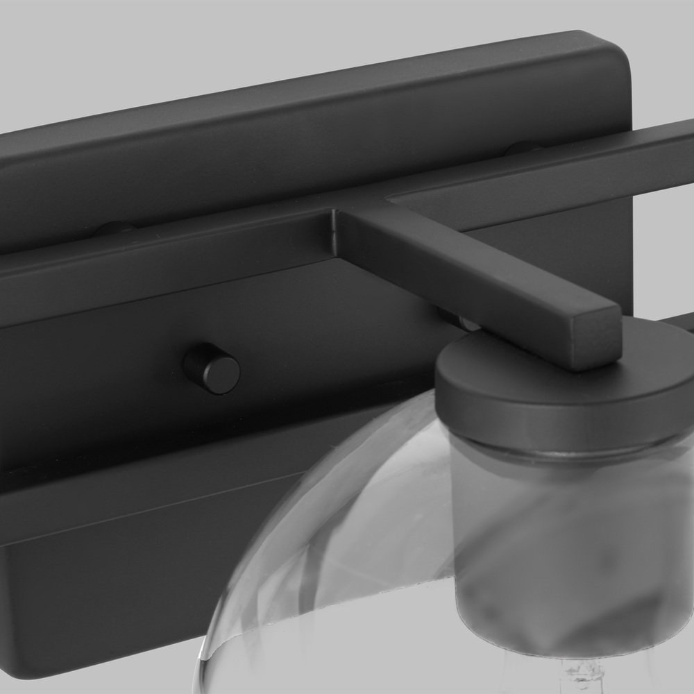 The Codyn three light vanity fixture in Midnight Black is a contemporary take on a classic mid-century design. Clear glass shades with open-ended spheres accent the elongated keyhole strap detail, for a clean look. This minimalist collection relies on subtle details to create visual interest