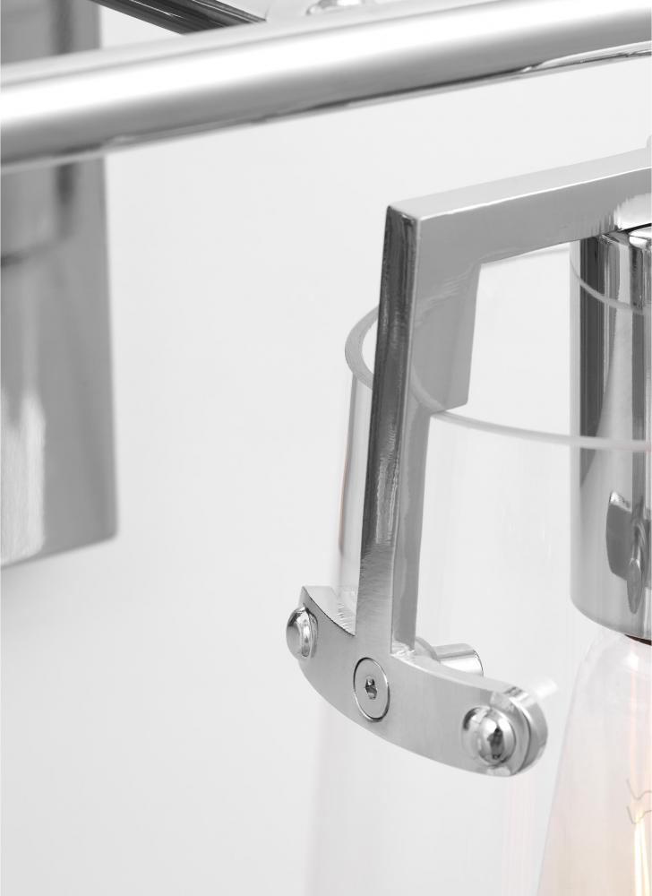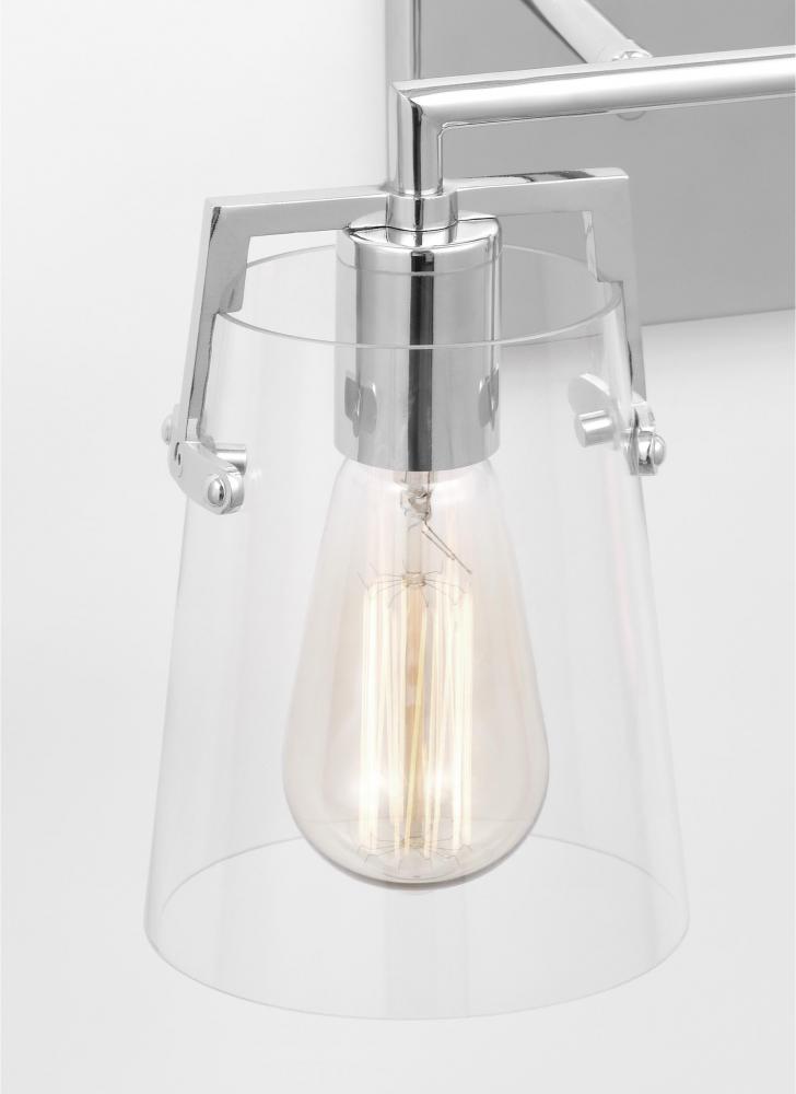 Made to coordinate across a broader range of bath hardware and design styles, this light adds bright light where you need it most with its clear glass shades and sleek metal backplate in striking, modern finishes