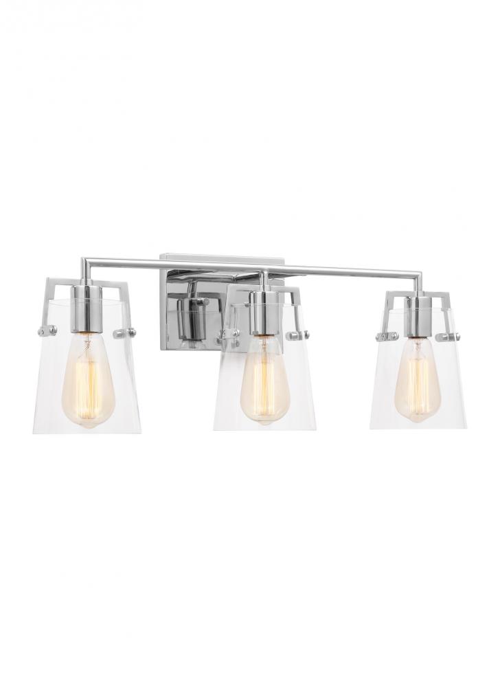 Add a bright burst of light where you need it most with the stylish Drew & Jonathan Crofton Three Light Wall / Bath Sconce, featuring a sleek rectangular metal backplate and clear glass shades. Made to coordinate across a broader range of bath hardware and design styles, the Crofton is available in four popular finishes, Brushed Steel, Chrome, Midnight Black, and Satin Brass. This light looks great on its own or installed above a bathroom vanity, and the glass shades make it ideal for filament bulbs. This fixture may be mounted in the up or down position, and is cETL listed for damp locations, making it the perfect lighting solution for any space.