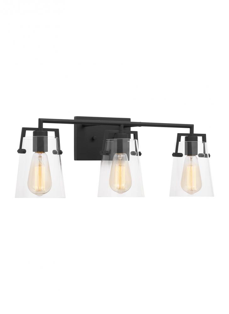 Add a bright burst of light where you need it most with the stylish Drew & Jonathan Crofton Three Light Wall / Bath Sconce, featuring a sleek rectangular metal backplate and clear glass shades. Made to coordinate across a broader range of bath hardware and design styles, the Crofton is available in four popular finishes, Brushed Steel, Chrome, Midnight Black, and Satin Brass. This light looks great on its own or installed above a bathroom vanity, and the glass shades make it ideal for filament bulbs. This fixture may be mounted in the up or down position, and is cETL listed for damp locations, making it the perfect lighting solution for any space.
