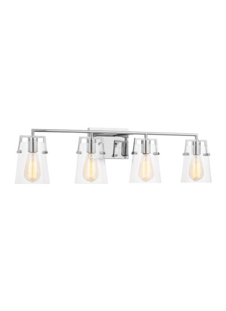 Add a bright burst of light where you need it most with the stylish Drew & Jonathan Crofton Four Light Wall / Bath Sconce, featuring a sleek rectangular metal backplate and clear glass shades. Made to coordinate across a broader range of bath hardware and design styles, the Crofton is available in four popular finishes, Brushed Steel, Chrome, Midnight Black, and Satin Brass. This light looks great on its own or installed above a bathroom vanity, and the glass shades make it ideal for filament bulbs. This fixture may be mounted in the up or down position, and is cETL listed for damp locations, making it the perfect lighting solution for any space.