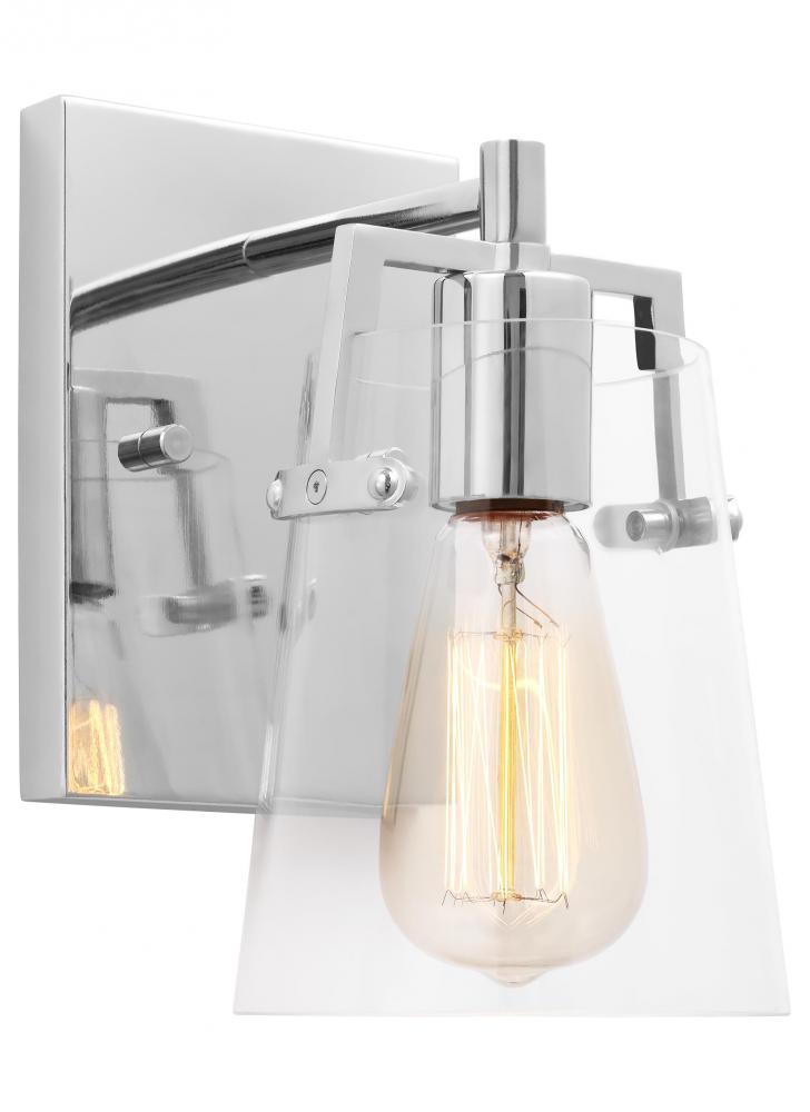 Add a bright burst of light where you need it most with the stylish Drew & Jonathan Crofton Small Sconce, featuring a sleek rectangular metal backplate and clear glass shade. Made to coordinate across a broader range of bath hardware and design styles, the Crofton is available in four popular finishes, Brushed Steel, Chrome, Midnight Black, and Satin Brass. This light looks great on its own or installed above a bathroom vanity, and the glass shade makes it ideal for filament bulbs. This fixture may be mounted in the up or down position, and is cETL listed for damp locations, making it the perfect lighting solution for any space.