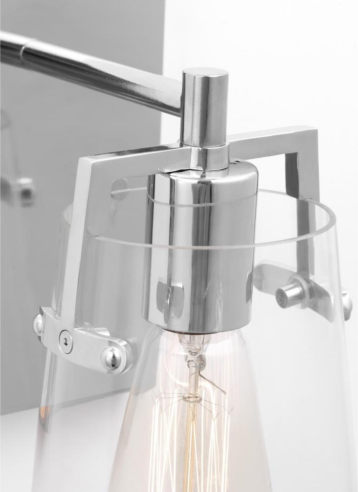 Made to coordinate across a broader range of bath hardware and design styles, this light adds bright light where you need it most with its clear glass shades and sleek metal backplate in striking, modern finishes