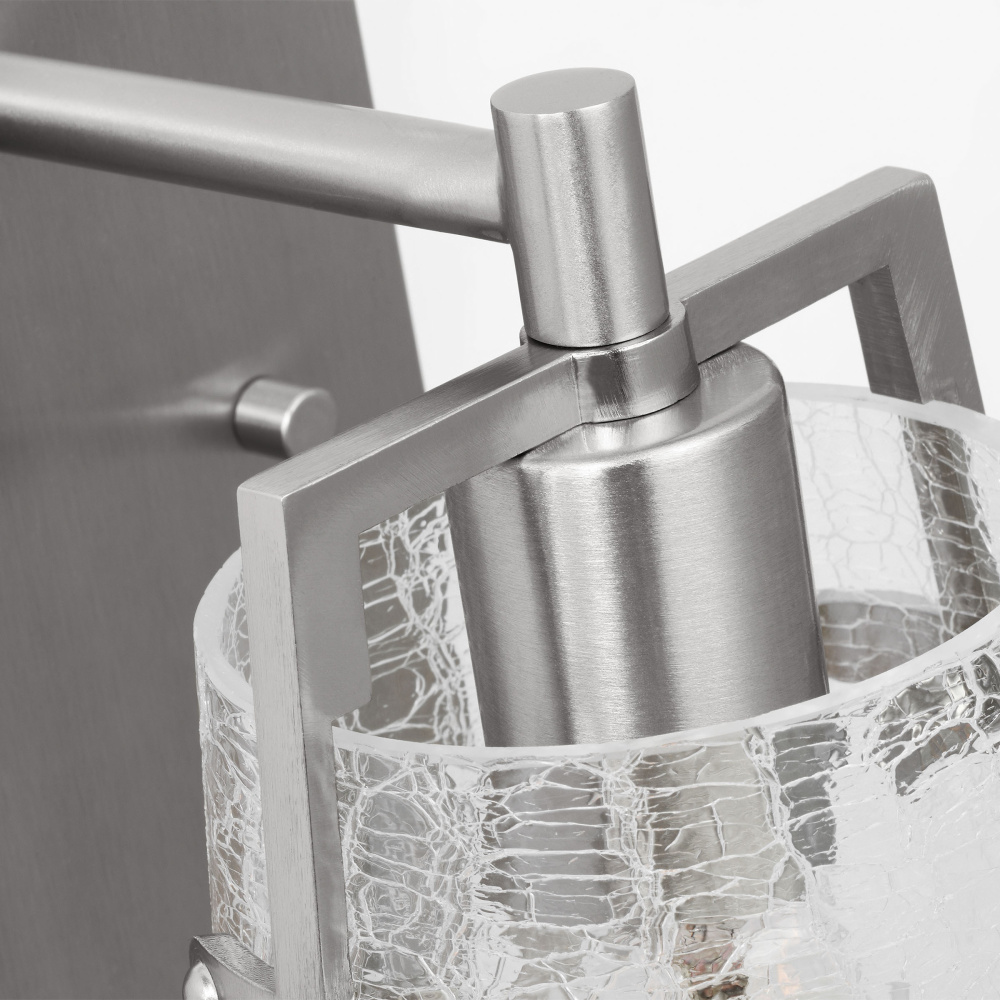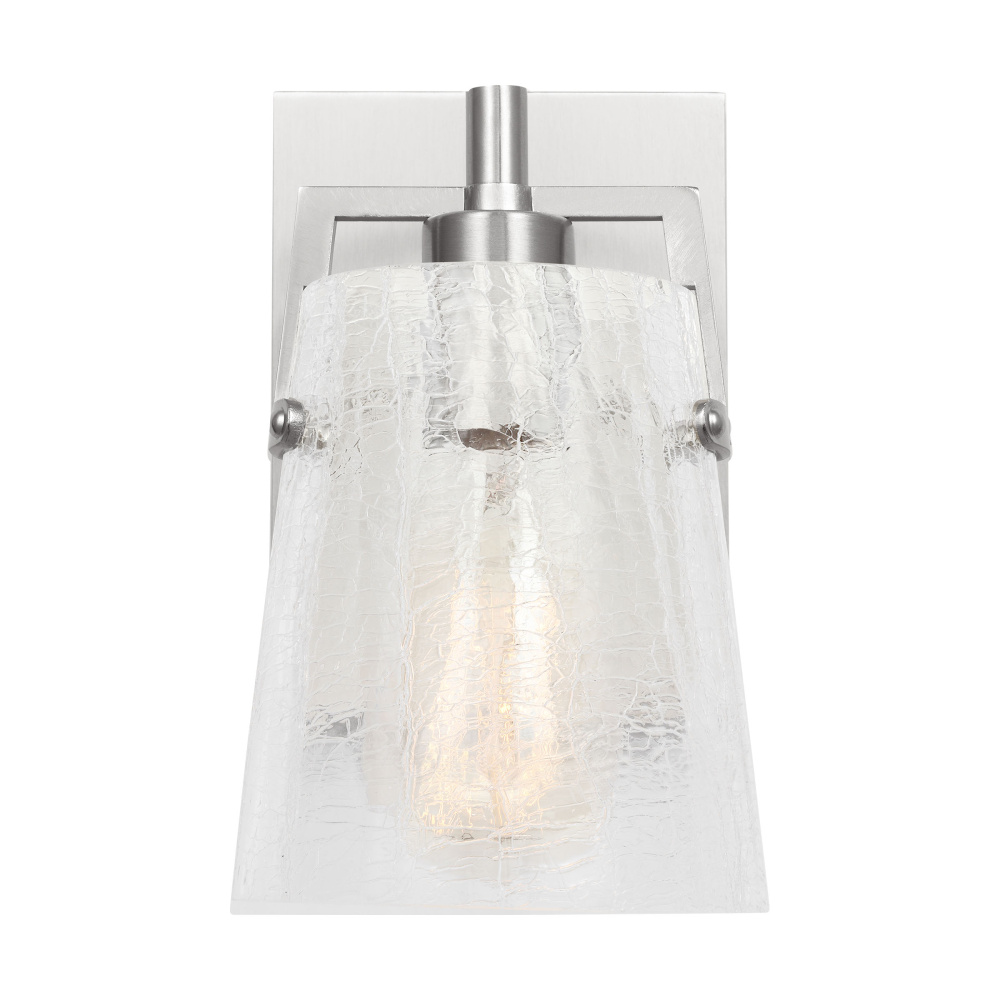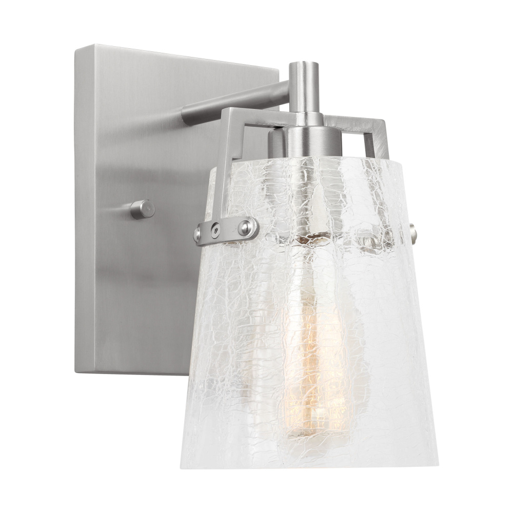 Add a bright burst of light where you need it most with the stylish Drew & Jonathan Crofton wall light, featuring a sleek rectangular metal backplate and crackle clear glass shade. Made to coordinate across a broader range of bath hardware and design styles, the Crofton is available in four popular finishes, Brushed Steel, Chrome, Midnight Black, and Satin Brass. This light looks great on its own or installed above a bathroom vanity, and the glass shade makes it ideal for filament bulbs. This fixture may be mounted in the up or down position, and is cETL listed for damp locations, making it the perfect lighting solution for any space.