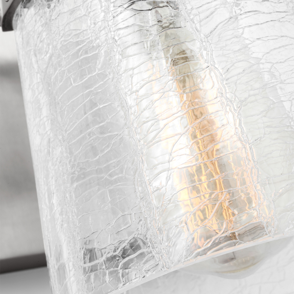 Crafted with Steel in a Brushed Nickel finish with clear crackle glass shade
