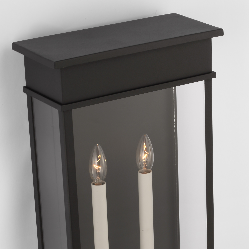 The Cupertino outdoor series by Chapman & Myers was created to embody a more transitional classic rectangular lantern profile. Rather than feature filament tube bulbs, each lantern has a more traditional candelabra with cream candle tubes to complete the design. The top and bottom of each lantern have an almost architectural stepped detailing.