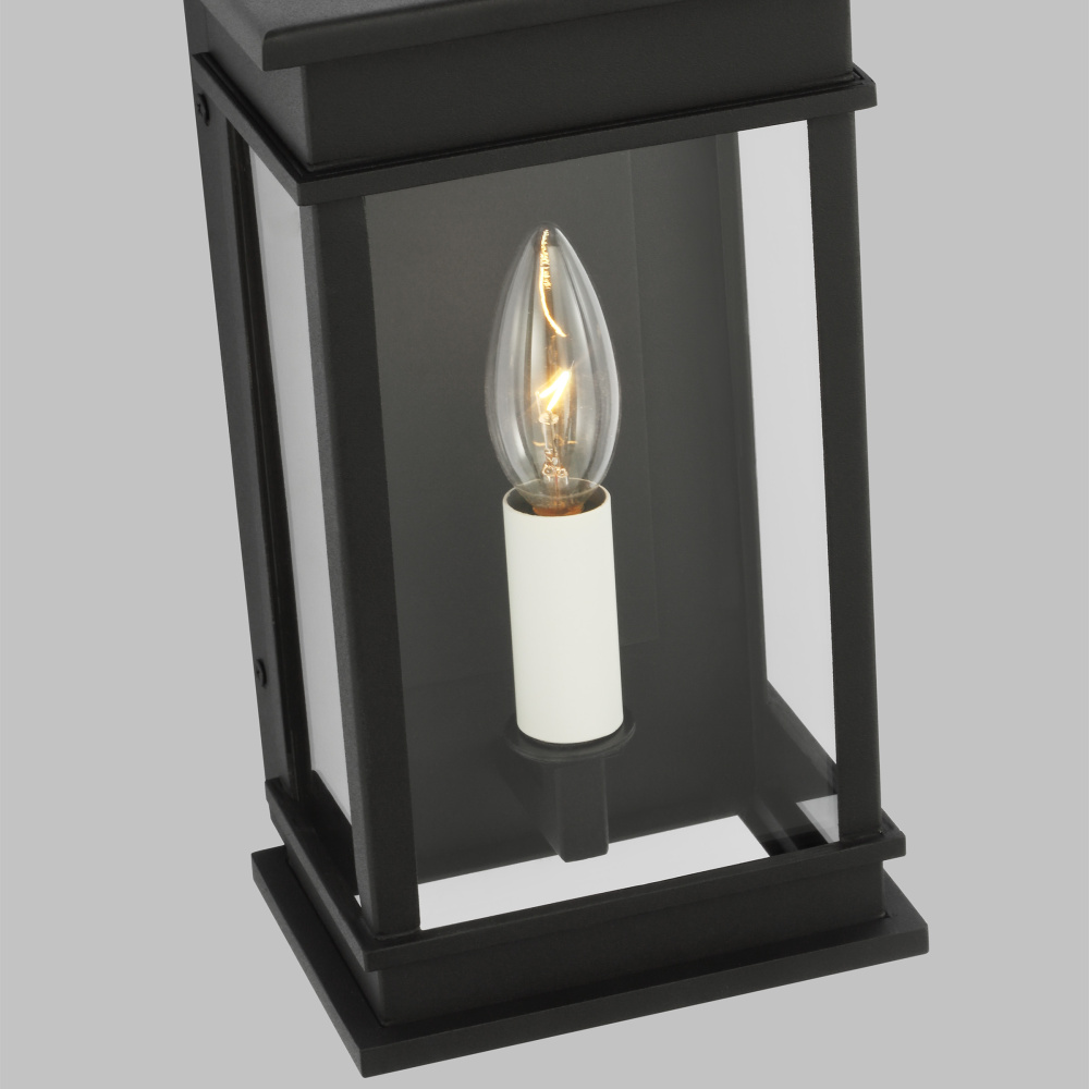 The Cupertino outdoor series by Chapman & Myers was created to embody a more transitional classic rectangular lantern profile. Rather than feature filament tube bulbs, each lantern has a more traditional candelabra with cream candle tubes to complete the design. The top and bottom of each lantern have an almost architectural stepped detailing.