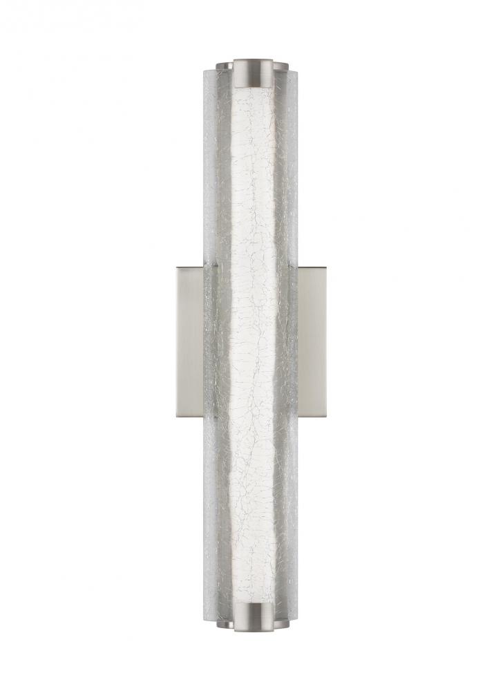 The Cutler one-light wall sconce in satin nickel offers shadow-free lighting in your powder room, spa, or main bathroom. The sleek linear profile of the Cutler Collection creates a perfect, contemporary backdrop for two unique glass options. Tiles of either Clear Crackle glass or Clear Staggered Rock glass are set in an organic version of a subway tile "look" and allow the LED light to shine through, adding rich sparkle to the room. Cutler is available in two finish options: Chrome and Satin Nickel.